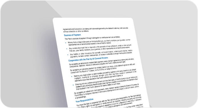 69 Agreement and Consent to Lien along with acknowledgement by the claimant’s attorney, both executed without alteration or other conditions. Sources of Payment The Plan’s sourc es of payment through subrogation or reimbursement are as follows: • Money from a responsible party or third party that you, your family members, your guardian, or other representatives or beneficiaries receive or are entitled to receive; • Any constructive trust that is imposed on the proceeds of any settlement, verdict or other amount that you, your family members, your guardian, or other representatives or beneficiaries receive; • Any liability or other insurance (for example, uninsured motorist, underinsure d motorist, medical payments, no - fault, school, homeowners, or excess or umbrella coverage) that is paid or payable. Cooperation with the Plan by All Covered Persons By accepting an advance for related claim payment, every claimant agrees to do nothing tha t will waive, compromise, diminish, release or otherwise prejudice the Fund’s reimbursement rights. By accepting an advance payment for related claims to an injury, every claimant agrees to notify and consult with the Board of Trustees, its Fund Office or designee before: • Starting any legal action or administrative proceeding against a third party based on any alleged negligent, intentional or otherwise wrongful action that may have caused or contributed to the claimant’s injury that resulted in the Fund’s advance payment of claims; or • Entering into any settlement agreement with that third party or that third party’s insurer that may be related to any actions by that third party that may have caused or contributed to the claimant’s injury that resulted in th e Fund’s advance for claims related to such injury. By accepting an advance in claim payments, every claimant agrees to keep the Board of Trustees, its Fund Office or designee informed of all material developments with respect to all such claims, actions, or proceedings. Your Responsibilities You have the duty to cooperate fully with the Plan and any party designated by the Plan Administrator if the Plan’s rights of subrogation or reimbursement are asserted, including executing and delivering any documents the Plan may require or appearing in court for a deposition or testimony, if necessary. You must do nothing to prejudice the Plan’s rights of subrogation and reimbursement. When making or filing a claim, you or your legal representative must give the Plan written notice about whether or not you were injured by a third party. You also must provide the following information in a timely manner: • The name, address and telephone number of: The third party who in any way caused the injury, as well as the attorney representing the third party; The third party’s insurer; and The attorney who represents you with respect to the third party’s act or omission. • Before any meeting, the date, time and location of the meeting between the third party or his or her attorney an d yourself or your attorney; • All terms of any settlement offer made by the third party or his or her insurer;