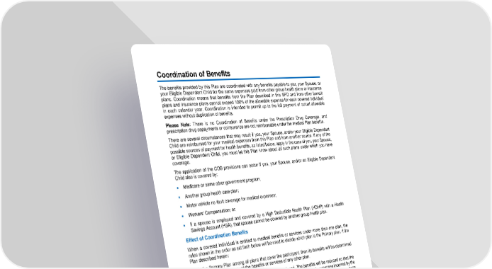 63 Coordination of Benefits The benefits provided by this Plan are coordinated with any benefits payable to you, your Spouse, or your Eligible Dependent Child for the same expenses paid from other group health plans or insurance plans. Coordination means that benefits from the Plan described in this SPD and from other benefit plans and insurance plans cannot exceed 100% of the allowable expense for each covered individual in each calendar year. Coordination is intended to permit up to the full payment of actual allowable expenses without duplication of be nefits. Please Note : There is no Coordination of Benefits under the Prescription Drug Coverage, and prescription drug copayments or coinsurance are not reimbursable u nder the medical Plan benefits. There are several circumstances that may result if you, your Spouse, and/or your Eligible Dependent Child are reimbursed for your medical expenses from this Plan and from another source. If any of the possible sources of payment for health benefits, as lis ted below, apply in the case of you, your Spouse, or Eligible Dependent Child, you must let this Plan know about all such plans under which you have cover age. The application of the COB provisions can occur if you, your Spouse, and/or an Eligible Dependent Child also is covered by: • Medicare or some other government program; • Another group health care plan; • Motor vehicle no - fault coverage for medical expenses; • Workers’ Compensation; or. • If a spouse is employed and covered by a High Deductible Health Plan ( HDHP) with a Health Savings Account (HSA), that spouse cannot be covered by another group health plan. Effect of Coordination Benefits When a covered individual is entitled to medical benefits or services under more than one plan, the rules shown in the o rder as set forth below will be used to decide which plan is the Primary plan . If the Plan described herein: 1. Is the Primary Plan among all plans that cover the participant, then its benefits will be determined without taking into account the benefits or se rvices of any other plan. 2. Is not the Primary Plan , then its benefits may be reduced. The benefits will be reduced so that the benefits provided by all plans will not be more than 100% of the allowable expenses incurred by the applicable participant. The be nefits provided under a Plan include the benefits that would have been provided if a claim had been duly made. The benefits from this Plan will never be greater than those that would be paid in the absence of other coverage. How Much the Plan Pays When it is Secondary When the Plan described in this SPD pays second, it will pay the same benefits that it would have paid had it paid first, less whatever payments were made by the plan (or plans) that was required to pay first. In addition, when this Plan pays second, it will never pay more in benefits than it would have paid had it paid the claim as the primary plan. Deductibles, coinsurance, and exclusions of this Plan still apply. As a result, when this Plan pays second, you may not receive 100% of the total cost of the covered health care services.