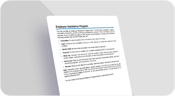 33 Employee Assistance Program The Plan provides a n Employee Assistance Program ( EAP). The EAP offers consultation, support, information and planning, as well as referrals to professional resources. There is no charge to you or d members of your household for using the EAP program and participation is voluntary and confidential. Services provided under the EA P include such as: • Counseling: 3 in - person sessions with a counselor in your area at no charge. • Legal: 30 - minute free consultation and up to a 25% discount on select fees ; referrals to local providers. • Identity Theft: 60 - minute free consultation with a fraud resolution specialist. • Financial: 30 - min ute free consultation with a qualified specialist and 25% off tax preparation. • Child care: Resource and referrals for child care providers, before and after school programs, camps, adoption organizations and information on parenting questions and p renatal care • Senior care: Resource and referrals for home health agencies, assisted living facilities, social and recreational programs, and long - distance care giving. • Pet care: Resource and referrals for pet sitting, obedience training, veterinarians, and pet st ores. Note: Information and/or recommendations received relating to the EAP do not imply that you are eligible for the coverage under the Plan. You should contact Cigna to confirm whether you or members of your household ar e eligible for the EAP, for any r ecommended services, or to get answers to any questions about the EAP . You can contact the Employee Assistance Program directly by calling 888 - 325 - 3978 .