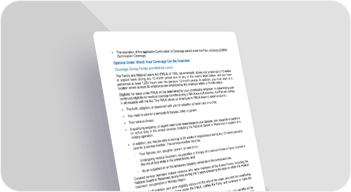 14 • The expiration of the applicable Continuation of Coverage period under the Plan, including COBRA Continuation Coverage. Options Under Which Your Covera ge Can Be Extended Coverage During Family and Medical Leave The Family and Medical Leave Act (FMLA) of 1993, (as amended), allows you to take up to 12 weeks of unpaid leave during any 12 - month period due to any of the events listed below, and you have perf ormed at least 1,250 hours over the previous 12 - month period. In addition, you must work at a location where at least 50 employees are employed by the employer within a 75 - mile radius. Eligibility for leave under FMLA will be determined by your contributi ng employer. In determining your continued eligibility for medical coverage benefits during a FMLA leave of absence, the Plan will comply in all respects with the Act. The FMLA allows an Employee to FMLA leave of absence due to: • The birth, adoption, or pla cement with you for adoption or foster care of a child; • You need to care for a seriously ill Spouse, child, or parent; • Your serious illness; • A qualifying exigency, or urgent need to for leave because your Spouse, son, daughter or parent is on active duty in the armed services (including the National Guard or Reserves) in support of a military operation. • In addition, you may be able to take up to 26 weeks of unpaid leave during any 12 - month period to care for a service member. The service member must be: Your Spouse, son, daughter, parent, or next of kin; Undergoing medical treatment, recuperation or therapy for a serious illness or injury incur red in the line of duty while in the armed forces; and As an outpatient or on the temporary disability retired list of the armed services. Co vered service members include veterans who were members of the Armed Forces (including the National Guard or Reserv es) at any time during the 5 years preceding the date on which the medical treatment, recuperation or therapy began. The Fund will maintain your prior eligibility status until the end of the leave, provided the contributing Employer properly grants the le ave under the FMLA, notifies the Fund, and continues to make the required contribution to the Fund. If you and your employer have a dispute over your eligibility under the FMLA, your benefits will be suspended pending resolution of the dispute, in the absence of the required contribution. The Board of Trustee will have no direct role in resolving the dispute. Coverage under the Plan will continue during the FMLA leave on the same basis as othe r similarly situated employees. Call your employer to determi ne if you are eligible for the FMLA leave. Then contact the Fund Office if you are planning to take the FMLA leave so that the Fund is aware of your employer’s responsibility to make contributions during your absence. The Board of Trustee cannot enforce co llection of contributions from your employer while you are out on leave. However, you may seek guidance regarding your continued coverage from the Department of Labor ( DOL), EBSA division. Coverage During Qualified Military Service If you enter qualified m ilitary service (such as active or inactive duty training or active duty in the United States armed forces or national guard), under the Uniformed Services Employment and Reemployment Rights Act (USERRA), your eligibility for coverage under the Plan may be protected during the qualified