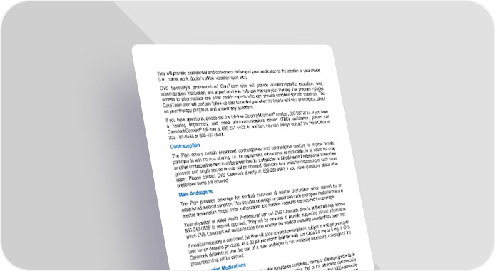 60 they will prov ide confidential and convenient delivery of your medication to the location of your choice (i.e., home, work, doctor’ s office, vacation spot, etc.) CVS Specialty ’s pharmacist - led CareTeam also will provide condition - specific education, drug administration instruction, and expert advice to help you manage your therapy. The program includes access to pharmacists and other health experts who can provide condition - specific materials. The CareTeam also will perform follow - up calls to remind you when it’s time to refill your prescription, check on your therapy progress, and answer any questions. If you have questions, please call the toll - free CaremarkConnect ® number, 800 - 237 - 2767. If you have a hearing impairment and need telecommunications device (TDD) assistan ce, please call CaremarkConnect ® toll - free at 800 - 231 - 4403. In addition, you can always contact the Fund Office at 202 - 785 - 8148 or 800 - 457 - 3481. Contraception The Plan covers certain prescribed contraceptives and contraceptive devices for eligible female participants with no cost sharing, i.e ., no copayment , coinsurance or deductible . In all cases the drug or other contraceptive item must be prescribed by a physician or Allied Health Professional. Prescribed generics and single source brands will be covere d. Standard time limits for dispensing of such items apply. Please contact CVS Caremark directly at 866 - 282 - 8503 if you have questions about what prescribed items are covered. Male Androgens The Plan provides coverage for medical treatment of erectile dys function when caused by an established medical condition. This includes coverage for prescribed male androgens (testosterone and erectile dysfunction drugs). Prior authorization and medical neces sity are required for coverage. Your physician or Allied Heal th Professional can call CVS Caremark directly at their toll - free number 855 - 240 - 0536 to request approval. They will be required to provide supporting clinical information; which CVS Caremark will review to determine whether the medical n ecess ity standard has been met. If medical necessity is confirmed, the Plan will allow covered prescriptions, subject to a 10 - pill per month limit for on demand products, or a 30 - pill per month limit for daily use Cialis 2.5 mg or 5 mg. If CVS Caremark determines that the u se of a male androgen is not medically necessary, coverage of the p rescribed drug will be denied. Compounded Medications A compounded medication is a medication that is made by combining, mixing or altering ingredients, in response to a prescription, to c reate a customized medication that is not otherwise commercially available. Any medication classified as a compounded medication that costs more than $300 will require prior authorization before it is covered under the terms of the Plan. Bulk powders and h igh cost proprietary bases are not covered under the Plan. One fill of a compound medication is allowed in a 34 - day period. If your physician or Allied Health Professional prescribes a compound medication for you, your Spouse, or your Eligible Dependent Ch ildren, you should ask him or her to call CVS Caremark at 800 - 294 - 5979 to request prior authorization before the prescription is filled. Federally Required Coverage Federal law requires that some prescription drugs and over the counter drugs with a prescri ption be covered at 100%. CVS Caremark regularly updates the list of these drugs to reflect required changes. For current information on what is include on the list, please call the CVS Caremark Customer Care line at 800 - 282 - 8503.