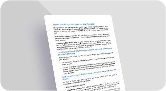 90 When the Disclosure of your PHI Requires your Written Authorization A lthough the Fund does not routinely obtain psychotherapy notes, it must generally obtain your written authorization before the Fund will use or disclose psychotherapy notes about you. However, the Fund may use and disclose such notes when needed by the Fun d to defend itself against litigation filed by you. Psychotherapy notes are separately filed notes about your conversations with your mental health professional during a counseling session. They do not include summary information about your mental health t reatment. Disclosure to Other Benefit Plans. On certain occasions, it may be necessary to receive information from the Health Fund in order to process life insurance benefits, Weekly Disability Income Benefits or benefits from the Pension Fund. In those ca ses, we will request an authorization from you to release such information in order to continue processing your ben efits. Use or Disclosure of Y our PHI t hat Requires Y ou b e Given an Opportunity to Agree or Disagree Before the Use or Release Disclosure of y our PHI to family members, other relatives and your close personal friends is allowed under federal law if: • The information is directly relevant to the family or friend’s involvement with your care or payment for that care, and • You have either agreed to th e disclosure or have been given an opportunity to object and have not objected. You should note that under certain circumstances described below, federal law allows the use and disclosure of your PHI without your consent, authorization or opportunity to ob ject to such use or disclosure. Use or Disclosure of Y our PHI for Which Consent, Authorization or Opportunity to Object i s Not Required The Fund is allowed under federal law to use and disclose your PHI without your consent or authorization under the following circumstances: • When required by applicable law. • Public health purposes. To an authorized public health authority if required by law or for public health and safety purposes. PHI may also be used or disclosed if you have been exposed to a communic able disease or are at risk of spreading a disease or condition, if authorized by law. • Domestic violence or abuse situations. When authorized by law to report information about abuse, neglect or domestic violence to public authorities, if a reasonable beli ef exists that you may be a victim of abuse, neglect or domestic violence. In such case, the Fund will promptly inform you that such a disclosure has been or will be made unless that notice would cause a risk of serious harm. • Health oversight activities. T o a health oversight agency for oversight activities authorized by law. These activities include civil, administrative or criminal investigations, inspections, licensure or disciplinary actions (for example, to investigate complaints against health care pr oviders) and other activities necessary for appropriate oversight of government benefit programs (for example, to the Department of Labor). • Legal proceedings. When required for judicial or administrative proceedings. For example, your PHI may be disclosed in response to a subpoena or discovery request that is accompanied by a court order.