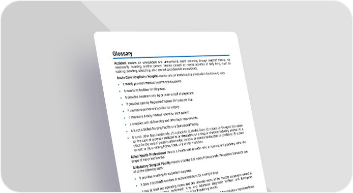 102 Glossary Ac cident means an unexpected and unintentional event occurring through external means, not necessarily involving another person. Injuries caused by normal activities of daily living (such as walking, bending, stretching, etc.) are not considered to be accide nts. Acute Care Hospital or Hospital means only an institution that meets all of the following tests: • It mainly provides medical treatment to inpatients. • It maintains facilities for diagnosis. • It provides treatment only by or under a staff of physicians. • I t provides care by Registered Nurses 24 hours per day. • It maintains permanent facilities for surgery. • It maintains a daily medical record for each patient. • It complies with all licensing and other legal requirements. • It is not a Skilled Nursing Facility or a Specialized Facility. • It is not, other than incidentally, (1) a place for Custodial Care; (2) a place for the aged; (3) a place for the care of a person addicted to or dependent on a drug or chemical including alcohol; (4) a place for the care of person s with mental, nervous, or emotional disorders or conditions; (5) a place of rest; or (6) a nursing home, hotel, or a similar institution. Allied Health Professional means a health care provider who is licensed and practicing within the scope of his or he r license. Ambulatory Surgical Facility means a facility that meets Professionally Recognized Standards and all of the following tests: • It provides a setting for outpatient surgeries. • It does not provide services or accommodations for overnight stays. • It has at least two operating rooms and one recovery room; all the medical equipment needed to support the surgery performed; x - ray and laboratory diagnostic facilities; and Emergency equipment, trays, and supplies for use in life threatening events. • It has a medical staff that is supervised full time by a physician and that includes a registered Nurse at all times when patients are in the facility. • It maintains a medical record for each patient. • It has a written agreement with a local Acute Care Hospital and a local ambulance company for the immediate transfer of patients who require greater care than can be furnished at the facility. • It complies with all licensing and other legal requirements. • It is not the office or clinic of one or more physicians. For purp oses of determining a medical benefit, a surgical procedure performed in an Ambulatory Surgical Facility that, as determined by the Claims Administrator, is commonly performed in a physician’s office shall be deemed to have been performed in a physician’s office.