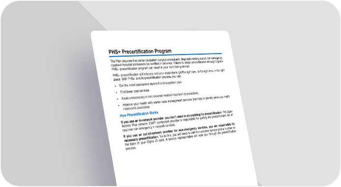 29 PHS+ Precertification Program The Plan requires th at certain outpatient surgical procedures, diagnostic testing and all non - emergency inpatient hospital admissions be certified in advance. Failure to obtain precertification through Cigna’s PHS+ precertification program can result in your claim being denie d. PHS+ precertification will help you and your dependents get the right care, at the right time, in the right place. With PHS+ and its precertification process, you can: • Get the most appropriate inpatient and outpatient care • Find lower cost services • Avo id unnecessary or non - covered medical treatment or procedures • Improve your health with earlier case management services that help to identify when you might need extra assistance How Precertification Works If you use an in - network provider, you don’t nee d to do anything for precertification. The Open Access Plus network (OAP) contracted provider is responsible for getting the precertification for all required non - emergency in - network services. If you use an out - of - network provider for non - emergency services, you are responsible for necessary precertification. To do this, you will need to call the customer service phone number on the back of your Cigna ID card. A service representative will walk you through the precertification process.