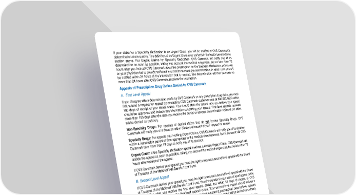 81 If your claim for a Specialty Medication is an Urgent Claim, you will be notified of CVS Caremark ’s determination more quickly. The definition of an Urgent Claim is as set forth in the health benefit claims section above. For Urgent Claims for Specialty Medication, CVS Care mark will notify you of its determination as soon as possible, taking into account the medical exigencies, but no later than 72 hours after you first call CVS Caremark about the prescription for the Specialty Medication, unless you or your physician fail t o provide sufficient information to make the determination, in which case you will be notified within 24 hours of the information that is needed. The determination will then be made no more than 24 hours after CVS Caremark receives the information. Appeal s of Prescription Drug Claims Denied by CVS Caremark A. First Level Appeal If you disagree with a determination made by CVS Caremark on any prescription drug claim, you must first submit a request for appeal by contacting CVS Caremark customer care at 800 - 282 - 8503 within 180 days of receipt of your denial notice. You should state the reason why you believe your appeal should be approved and include any information supporting your appeal. First level appeals received more than 180 days after the date you receiv e the denial or adverse determination notice of the claim will be denied as untimely. Non - Specialty Drugs: For appeals of denied claims that do not involve Specialty Drugs, CVS Caremark will notify you of a decision within 30 days of receip t of your request for review. Specialty Drugs: For appeals not involving Urgent Claims, CVS Caremark will notify you of its decision within a reasonable period of time appropriate to the medical circumstances, but in no event will CVS Caremark take more t han 15 days to notify you of its decision. Urgent Claim: If the Specialty Medication appeal involves a denied Urgent Claim, CVS Caremark will decide the appeal as soon as possible, taking into account the medical exigencies, but no later than 72 hours aft er receipt of the appeal. If CVS Caremark denies your appeal, you have the right to request a second level appeal with the Board of Trustees of the National IAM Benefit Trust Fund . B. Second Level Appeal If CVS Caremark denies your appeal, you have the right to request a second level appeal with the Board of Trustees of the National IAM Benefit Trust Fund. You should submit your second level appeal to the Fund Office after you receive the first level appeal denial, but w ithin 9 0 days of receipt of CVS Caremark’s denial notice on the first level appeal review . Your second level appeal should include a copy of the first level appeal denial , and any information supporting your appeal. Second lev el appeals received more than 9 0 days after rec e ipt of the first level appeal denial notice will be denied as untimely. The Board of Trustees will review your appeal on the date of the first Board meeting that immediately follows the Plan’s receipt of your request for review, unless the request for review is filed within 30 days preceding the date of such meeting. In such case, a benefit determination may be made on the date of the second meeting following the Plan’s receipt of the request for review. If special circumstances require a further extension of time for processing, a determination will be made no later than the third meeting following the initial receipt of the appeal. If an extension is required, you will be notified of the extension and the reasons for it prior to the co mmencement of the extension. If the Specialty Medication appeal is related to a denied Urgent Claim, the final decision on the appeal will be made as soon as possible, taking into account the medical exigencies, but no later than 72 hours after receipt of the appeal by the Fund Office.