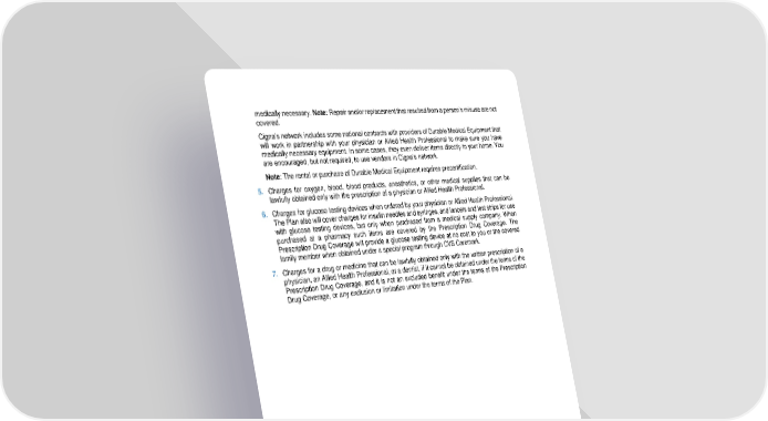 36 medically necessary. Not e: Repair and/or replacement that resulted from a person’s misuse are not covered. Cigna’s network includes some national contracts with providers of Durable Medical Equipment that will work in partnership with your physician or Allied Health Professional to make sure you have medically necessary equipment. In some cases, they even deliver items directly to your home. You are encouraged, but not required, to use vendors in Cigna’s network. Note : The rental or purchase of Durable Medical Equipm ent requires precertification. 5. Charges for oxygen, blood, blood products, anesthetics, or other medical supplies that can be lawfully obtained only with the prescription of a physician or Allied Health Professional. 6. Charges for glucose testing devices when ordered by your physician or Allied Health Professional. The Plan also will cover charges for insulin needles and syringes, and lancets and test strips for use with glucose testing devices, but only when purchased from a medical supply company. When purchased at a ph armacy such items are covered by the Prescription Drug Coverage. The Prescription Drug Coverage will provide a glucose testing device at no cost to you or the covered family member when obtained under a special program through CVS Caremark . 7. Charges for a drug or medicine that can be lawfully obtained only with the written prescription of a physician, an Allied Health Professional, or a dentist, if it cannot be obtained under the terms of the Prescription Drug Coverage, and it is not an excluded benefit und er the terms of the Prescription Drug Coverage, or any exclusion or limitati on under the terms of the Plan.