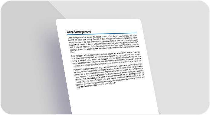 31 Case Management Case management is a service that assists covered individuals with treatment needs that extend beyond the acute care setting. The goal of case management is to ensure that patients receive appropriate care in the most effective setting possible; whether at home , as an outpatient, or as an Inpatient in a hospital. If there is a need for case management, a case management professional will work closely with the patient, the family members, and the attending physician to determine appropriate treatment options that would best meet the patient’s needs, while maintaining manageable costs to the Plan. Case managers will help coordinate the treatment program and arrange for the necessary resources. In addition, case managers will answer questions and provide ongoing sup port for the family members during a medical crisis. While case managers, who are trained Registered Nurses and other credentialed health care professionals, may recommend alternate treatment programs and coordinate resources, your attending physician rema ins in charge of, and responsible for, your actual medical care. Participation in case management program is recommended for patients who need post - hospitalization services, or who have difficulty in managing or dealing with a costly illness. Cigna, may on occasion, contact you or your attending physician if they believe that case management might be helpful in your case. However, it is important to remember that participation in the case management program is voluntary. You should discuss the option of the case management with your attending physician, and contact Cigna for more information. You, your Spouse, your Eligible Dependent Child, and/or your attending physician may request case management services by calling Cigna at the toll - free number on your i dentification card, 800 - 244 - 6224 or 800 - Cigna 24.
