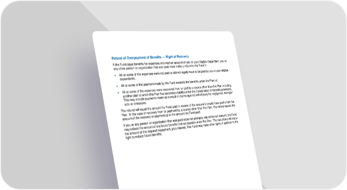 71 Refund of Overpayment of Benefits — Right of Recovery If the Fund pays benefits for expenses incurred on account of you or your Eligible Dependent, you or any other perso n or organization that was paid must make a refund to the Fund if: • All or some of the expenses were not paid or did not legally have to be paid by you or your eligible dependents; • All or some of the payment made by the Fund exceeds the benefits under the P lan; or • All or some of the expenses were recovered from or paid by a source other than this Plan including another plan to which this Plan has secondary liability under the Coordination of Benefits provisions. This may include payments made as a result of claims against a third party for negligence, wrongful acts or omissions. The refund will equal the amount the Fund paid in excess of the amount it should have paid under the Plan. In the case of recovery from or payment by a source other than this Plan, th e refund equals the amount of the recovery or payment up to the amount the Fund paid. If you or any person or organization that was paid does not promptly refund the full amount, the Fund may reduce the amount of any future benefits that are payable under the Plan. The reductions will equal the amount of the required repayment, plus interest. The Fund may have other rights in addition to the right to reduce future benefits.