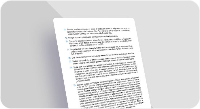 55 18. Services, supplies or procedures related to treatment of obesity or weight reduction, except as specifically provided under the terms of the Plan, and as set forth in the SPD in the sections on Areas of Limited Coverage and Preventive and Wellness Services. 19. Charges incurred for treatment of complications from excluded procedures. 20. Charges for servic es obtained on a date when the individual was not eligible to participate in the Plan, except where eligibility is provided under the extension of benefits for total disability under the terms of the Pla n, and as set forth in the SPD. 21. Drugs labeled: “Cauti on - limited by federal law to investigational use”, or experimental drugs, unless provided in connection with an approved clinical trial under the terms of the Plan, and a s set forth in the SPD. 22. Over the counter medicines and supplies, unless otherwise c overed as required under federal law 23. Routine eye examinations, refractions, glasses, contact lenses, or the fitting of glasses or contact lenses; except for the first pair of glasses or the first pair of lenses for use after cataract surgery. 24. Dental work o r dental treatment; unless it is rendered for: (a) surgical removal of impacted teeth; (b) treatment of tumors; (c) treatment of ectodermal dysplasias (except orthodontia); or (d) repair of damage to sound natural teeth if damage is sustained in an acciden t and the charges are incurred within one year from the date of the accident. The term “sound natural tooth” means a tooth that: (a) is organic and formed by the natural development of the body (not manufactured); (b) has not been extensively restored; and (c) has not become extensively decayed or i nvolved in periodontal disease. 25. Cosmetic surgery and therapies, unless resulting from an injury or illness occurring while covered under the Plan. Cosmetic surgery required by federal law will be covered. For services that are covered, precertification is required and claims must be received within one (1) year of the date of service. Cosmetic surgery or therapy is defined as surgery or therapy performed to improve or alter appearance or self - esteem, or to treat psychological symptomatology or psychosocial complaints related to one’s appearance. The Plan covers charges made for reconstructive surgery or therapy to repair or correct severe physical deformity or disfigurement which is accompanied by functional deficit (other than abnormalities of the jaw or conditions related to TMJ disorder which is covered under another benefit under the terms of the Plan) provided that: (a) the surgery or therapy restores or improves function; (b) reconstruction is required as a result of medically necessary, non - cosmetic surgery; or (c) the surgery or therapy is performed prior to age 19 and is required as a result of the congenital absence or agenesis (lack of formation or development) of a body part. Repeat or subsequent s urgeries for the same condition are covered only when there is the probability of significant additional improvement as determined by the utilization review process . 26. Anti - wrinkle agents. 27. Hair growth stimulants. 28. Exercise equipment, tanning booths, whirlpool s, swimming pools, saunas, spas, or h ealth club and gym memberships. 29. Charges for pre scription drug plan copayments. 30. Transsexual surgery including medical or psychological counseling and hormonal therapy in preparation for, or su bsequent to, any such surger y. 31. Coverage for the children of your children, unless such children are otherwise determined to be your qualified eligible dependents within the meaning of Section 152 of the Internal Revenue Code and legal documentation is provided to the Fund as require d during the enrollment process .