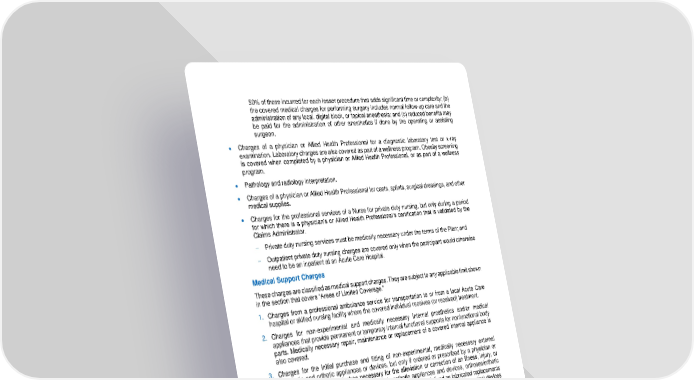 35 50% of those incurred for each lesser procedure that adds significant time or complexity; (b) the covered medical c harges for performing surgery includes normal follow - up care and the administration of any local, digital block, or topical anesthesia; and (c) reduced benefits may be paid for the administration of other anesthetics if done by the operating or assisting s urgeon. • Charges of a physician or Allied Health Professional for a diagnostic laboratory test or x - ray examination. Laboratory charges are also covered as part of a wellness program. Obesity screening is covered when completed by a physician or Allied Heal th Professional, or as part of a wellness program. • Pathology and radiology interpretation. • Charges of a physician or Allied Health Professional for casts, splints, surgical dressin gs, and other medical supplies. • Charges for the professional services of a N urse for private duty nursing, but only during a period for which there is a physician’s or Allied Health Professional’s certification that is validated by the Claims Administrator. Private duty nursing services must be medically necessary under the terms of the Plan; and Outpatient private duty nursing charges are covered only when the participant would otherwise need to be an inpatient at an Acute Care Hospital. Medical Support Charges These charges are classified as medical support charges. They are su bject to any applicable limit shown in the section that cover s “Areas of Limited Coverage.” 1. Charges from a professional ambulance service for transportation to or from a local Acute Care hospital or skilled nursing facility where the covered individual re ceives (or received) treatment. 2. Charges for non - experimental and medically necessary internal prosthetics and/or medical appliances that provide permanent or temporary internal functional supports for nonfunctional body parts. Medically necessary repair, m aintenance or replacement of a covered internal appliance is also covered. 3. Charges for the initial purchase and fitting of non - experimental, medically necessary external prosthetic and orthotic appliances or devices, but only if ordered or prescribed by a physician or Allied Health Professional when necessary for the alleviation or correction of an illness, injury, or congenital defect. This includes prostheses/prosthetic appliances and devices, orthoses/orthotic devices, braces and splints. Prostheses/prosthetic devices are defined as fabricated replacements for missing body part s, and include, but are not limited to, basic limb prostheses, terminal devices such as a hand or hook, and speech prostheses. Orthoses/orthotic devices are defined as orthopedic appliances and apparatus used to support, align, prevent or correct deformiti es. After a reasonable period of time, payment for replacement or repair of the prosthetic device may be authorized if determined to be medically necessary. Note: Repair and replacement that result from a person’s misuse are not covered. See the Podiatry C are benefit below for information about coverage for foot related orthotics. 4. Charges made for the purchase or rental of Durable Medical Equipment that is ordered or prescribed by a physician or Allied Health Professional up to the purchase price of standar d equipment (Durable Medical Equipment may be purchased if less expensive than rental, if accompanied by documentation from the physician or Allied Health Professional regarding the estimated period for the use of the equipment.) Coverage of Durable Medica l Equipment is limited to the lowest cost reasonable alternative. After a reasonable period of time, payment for replacement or repair of Durable Medical Equipment may be authorized if such repair or replacement is determined to be