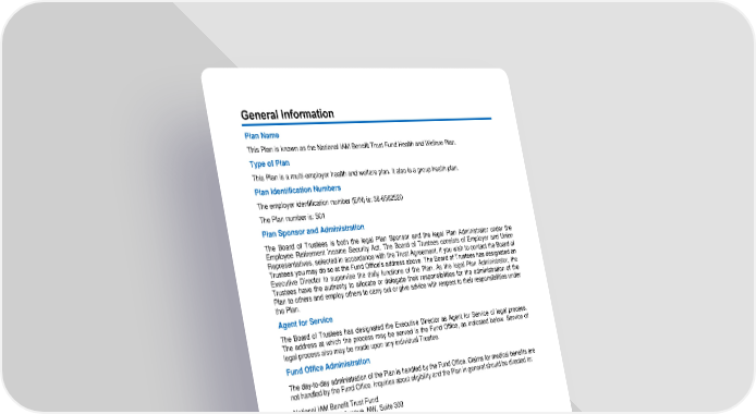 97 General Informatio n Plan Name This Plan is known as the National IAM Benefit Trus t Fund Health and Welfare Plan. Type of Plan This Plan is a multi - employer health and welfare plan. It also is a group health plan. Plan Identification Numbers The employer identification number (EIN) is: 36 - 6562520 The Plan number is: 501 Plan Sponsor and Administration The Board of Trustees is both the legal Plan Sponsor and the legal Plan Administrator under the Employee Retirement Income Security Act. The Board of Trustees consists of Employer and Union Representatives, selected in accordance with the Trust Agreement. If you wish to contact the Board of Trustees you may do so at the Fund Office’s address above. The Board of Trustees has designated an Executive Di rector to supervise the daily functions of the Plan. As the legal Plan Administrator, the Trustees have the authority to allocate or delegate their responsibilities for the administration of the Plan to others and employ others to carry out or give advice with respect to their responsibilities under the Plan. Agent for Service The Board of Trustees has designated the Executive Director as Agent for Service of legal process. The address at which the process may be served is the Fund Office, as indicated belo w. Service of legal process also may be ma de upon any individual Trustee. Fund Office Administration The day - to - day administration of the Plan is handled by the Fund Office. Claims for medical benefits are not handled by the Fund Office. Inquiries about eligibility and the Plan in general should be directed to: National IAM Benefit Trust Fund 1300 Connecticut Avenue, NW, Suite 300 Washington, DC 20036 Phone: 202 - 785 - 8148 Fax: 202 - 728 - 0585 www.iambtf.org The Fund Off ice performs the following: • Receives Employer contributions. • Keeps eligibility records. • Provides information about the Plan.