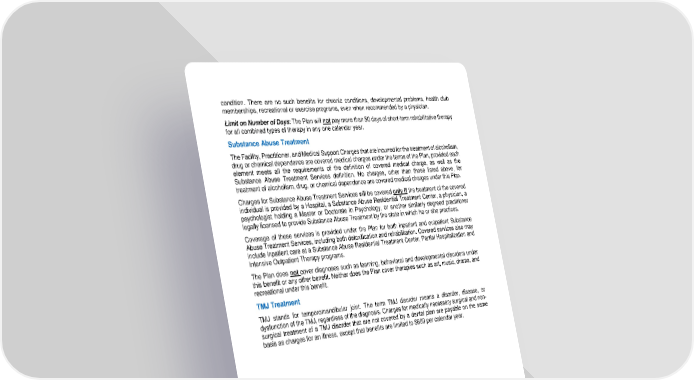 53 condi tion. There are no such benefits for chronic conditions, developmental problems, health club memberships, recreational or exercise programs, even when recommended by a physician . Limit on Number of Days : The Plan will not pay more than 50 days of short - ter m rehabilitative therapy for all combined types of therapy in any one calendar year. Substance Abuse Treatment The Facility, Practitioner, and Medical Support Charges that are incurred for the treatment of alcoholism, drug or chemical dependence are covere d medical charges under the terms of the Plan, provided each element meets all the requirements of the definition of covered medical charge, as well as the Substance Abuse Treatment Services definition. No charges, other than those listed above, for treatm ent of alcoholism, drug, or chemical dependence are covered medical charges under this Plan. Charges for Substance Abuse Treatment Services will be covered only if the treatment of the covered individual is provided by a Hospital, a Substance Abuse Residen tial Treatment Center, a physician, a psychologist holding a Master or Doctorate in Psychology, or another similarly degreed practitioner legally licensed to provide Substance Abuse Treatment by the state in which he or she practices. Coverage of these se rvices is provided under the Plan for both inpatient and outpatient Substance Abuse Treatment Services, including both detoxification and rehabilitation. Covered services also may include inpatient care at a Substance Abuse Residential Treatment Center, Pa rtial Hospitalization and Intensive Outpatient Therapy programs. The Plan does not cover diagnoses such as learning, behavioral and developmental disorders under this benefit or any other benefit. Neither does the Plan cover therapies such as art, music, d rama, and re creational under this benefit. TMJ Treatment TMJ stands for temporomandibular joint. The term TMJ disorder means a disorder, disease, or dysfunction of the TMJ, regardless of the diagnosis. Charges for medically necessary surgical and non - surg ical treatment of a TMJ disorder that are not covered by a dental plan are payable on the same basis as charges for an illness, except that benefits are limited to $600 per calendar year.