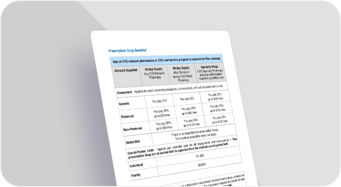 5 Prescription Drug Benefits 1 Use of CVS network pharmacies or CVS mail - service program is required for Plan coverage A mount Supplied 34 - day Supply Any CVS Network Pharmacy 90 - day Supply Mail - Service or Actual CVS Retail Pharmacy Specialty Drugs CVS Specialty P harmacy and pr ior authorization required; quantities vary Copayment - Applies for each covered prescription, unless noted, until out - of - pocket limit is met Generic You pay $10 You pay $20 You pay 20% up to $120 max Preferred You pay 20% up to $30 max You pay 20% up to $60 max You pay 20% up to $120 max Non - Preferred You pay 30% up to $60 max You pay 30% up to $120 max You pay 20% up to $120 max Deductible There is no deductible for prescription drugs. The m edical deductible does not apply. Out - of - Pocket Limit - Applies per calendar year for all copayments and coinsurance – This prescription drug out - of - pocket limit is separate from the medical out - of - pock et limit Individual $1,800 Family $3,600 Plan includes generic step therapy and prior authorization requirement for brand name drugs, compound drugs over $300, male androgens, and specialty medications. No copayment required for certain female contraceptives. Coverage provided through CVS Caremark network pharmacies only. 1 Note that under the medical plan, the schedule reflects what the plan will pay. However, under prescription drugs, the schedule reflects what you will pay per prescription fill for all plan options.