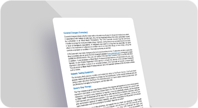 58 Covered Charges (F ormulary) Covered charges include only the reasonable and customary charges for drugs and medications, which, in accordance with federal or state laws, may not be dispensed without the written prescription issued by a physician or an Allied Health Profess ional. The CVS Caremark covered drug list (formulary) includes coverage for most prescription drugs; however, some products are excluded from the formulary in favor of therapeutic equivalents. A therapeutic equivalent is a drug that has essentially the sam e effect in the treatment of a disease or condition as one or more other drugs; or more simply, a drug that controls a symptom or condition in the exact same way as another. CVS Caremark may make changes to the formulary from time to time. To determine wh ether a particular drug is covered, you can go to the CVS Caremark website at www.caremark.com , and register to obtain specific benefit information. Also, you can call the CVS Caremark Customer Care line at 800 - 282 - 8503. In addition, if your physician or Allied Health Professional feels there is a clinical reason why you, your Spouse, or your Eligible Dependent Child cannot, or should not, use any of the available therapeutic equivalent alternatives in place of an excluded product, CVS Caremark will provide a review option. Your physician or Allied Health Professional can call CVS Caremark toll - free at 855 - 240 - 0536 to initiate such a review. Diabetic Testing Equipment The formulary lim its glucose monitors and related test strips to OneTouch devices. OneTouch blood glucose meters will be provided at no charge, by the manufacturer, to the covered individuals who are using a meter other than OneTouch. For more information on how to obtain a blood glucose meter, and any limitations that apply to the program, call 800 - 588 - 4456. Generic Step Therapy The Plan includes a generic step therapy program that requires participants to try one or more generic equivalent alternatives in most drug class es before the Plan will provide coverage for a brand name medication. If a brand name medication is required, it must be specifically ordered, and the physician or Allied Health Professional will be required to verify that the drug is medically necessary u sing the CVS Caremark prior authorization process. If you have not tried a generic alternative, and do not have prior authorization approval of medical necessity, you will be responsible for full payment of the brand name medication even if the prescriptio n is marked “ dispense as written ” . To avoid any confusion at the pharmacy, we suggest that you inform your physician or Allied Health Professional about the Generic Step Therapy program, and ask them to call CVS Caremark at 800 - 294 - 5979 before accepting a prescription for a brand name drug. CVS Caremark will inform your provider regarding whether the Plan covers the brand name drug, what alternatives are available, and will initiate the medical necessity review process where appropriate. If you have not tr ied a generic or generic equivalent to the brand name drug, your physician or Allied Health Professional will be offered generic alternative options, and will be required to select one. Your brand name prescription will be changed to the generic alternativ e chosen by your physician or Allied Health Professional. Exceptions to Generic Alternatives Your physician or Allied Health Professional can provide CVS Caremark with historic information about alternatives you have tried, if applicable, and request app roval for coverage of a brand name drug. Your physician or Allied Health Professional should provide a statement of medical necessity that explains the clinical reasons why the brand name drug is required. The brand name drug will be allowed if CVS Caremar k confirms medical necessity. Your provider also can call CVS Caremark directly at 800 - 294 - 5979 to request prior approval for coverage of a brand name drug, or to start the authorization process.