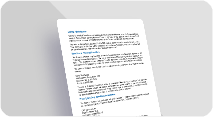 98 Claims Administrator Claims for medical benefits are processed by the Claims Administrator, which is Cigna Healthcare. Medical cl aims should be sent to the address on the back of your benefits identification card and inquiries should be made to the phone number on the back of your benefits identification card. The rules and regulations described in this SPD apply to claims incurred on or after January 1, 2018 . Your claims prior to this date will be processed and reimbursed based on the rules and regulations of the benefits under the Plan in for ce when the claim was incurred. Selection of Preferred Providers The Board of Trustees may from time to time, in its sole discretion, enter into written agreements with Preferred Provider Organizations. The use of such Preferred Provider Organizations is solely at your option. The existence of any Preferred Provider agreement does not, in any m anner, imply an endorsement of any specific provider, nor does it constitute any guarantee of the services rendered. The Board of Trustees currently has a contract with the following organization fo r a Preferred Provider network: Cigna Healthcare 111 S Calvert Street, Suite 1600 Baltimore, MD 21202 - 6106 Phone: 410 - 884 - 2500 The use of Preferred Providers is solely at your option. However, you should note that use of the Preferred Provider network will result in the lowest out - of - pocket expense for you. Th e existence of a Preferred Provider network does not, in any manner, imply an endorsement of any specific provider, nor does it constitute any guarantee of payment for the services rendered. Prescription Drug Benefits Administration The Board of Trustees has contracted with CVS C aremark for the prescription drug benefit, as part of the Fund’s participation in the Health Care Cost Containment Corporation (HCCCC): CVS Caremark, Inc. 9501 East Shea Blvd. Scottsdale, AZ 85260 - 6719 Phone: 888 - 727 - 5575 Trust Fund The assets of the National IAM Benefit Trust Fund are held in trust by the Board of Trustees. Identity of Source of Benefits All of the types of benefits provided by the Plan are set forth in this SPD . The Trust Fund is the sourc e of the benefits of this Plan. Plan Year The Plan year begins on January 1 and ends on December 31. Collective Bargaining Agreements This Plan is maintained pursuant to one or more collective bargaining agreements, or other type of agreement. A copy of any such agreement may be obtained upon written request to the Fund Office and is available for examination at the Fund Office. Upon written request, the Fund Office will tell you if an Employer is contributing to the National IAM Benefit Trust Fund on behalf of its Employees or will supply you with a list of such Employers.
