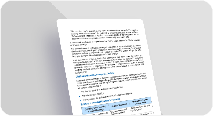 20 This extension may be available to any eligible dependents (if they are qualified beneficiaries) receiving continuation coverage if the participant or former participant dies, becomes entitled to Medicare benefits (under Part A, Part B o r both), or gets divorced or legally separated, or if the dependent child stops being eligible under the Plan as an eligible dependent child. In no event will any Spouse, or Eligible Dependent Child be eligible for more than 36 total months of continuation coverage. This extended period of continuation coverage is not available to anyone who became your Spouse after the termination of employment or reduction in hours. However, this extended period of continuation coverage is available to any child born to, adopted by, or placed for adoption with you (the active Employee) during the 24 - month period of cont inuation coverage. In no case are you entitled to Continuation Coverage for more than a total of 24 months if your employment is terminated or you have a r eduction in hours (unless you are entitled to an additional continuation coverage period on account of disability). Therefore, if you experience a reduction in hours followed by termination of employment, the termination of employment is not treated as a s econd qualifying event and continuation coverage may not be extended beyond 24 months from the initial, qualifying event. COBRA Continuation Coverage and Disability If you are a covered Employee and you lose coverage due to termination of employment as th e result of your disability, you may elect to enroll in COBRA Continuation coverage. As in the case of all COBRA Continuation Coverage, you must self - pay for the premiums during the coverage period. Your coverage will continue until the earliest of: • The da te you cease to be disabled or return to active work; • The date you attain age 65; or • The expiration of the applicable COBRA Continuation Coverage period. Summary of Periods of Continuation Coverage Qualifying Event Resulting i n Loss of Coverage Qualified Beneficiary Maximum Continuation Coverage Period 1. Termination of participant (for reasons other than gross misconduct Employee, Spouse, and Dependent Children 24 months after the date of the qualifying event 1 2. Participant reduction in work hours (making the participant ineligible for the coverage in place prior to reduction) Employee, Spouse, and covered Dependents 24 months after the date of the qualifying event 1 3. Death of Employee Surviving Spouse and Eligib le Dependent Children 36 months after the date of the qualifying event 4. Divorce or legal separation of participant Spouse or Dependent Children 36 months after the date of the qualifying event 5. Dependent child ceases to qualify for benefits under the Plan Child aging out of eligibility 36 months after the date of the qualifying event