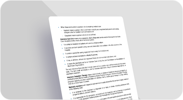 106 • When these terms refer to a person who is receiving medical care: Inpatient means a person who is confined in a facility as a registered bed patient and is being charged a fee for inpatient room and board; and Outpatient means a person who is not so confined. Intensive Care Unit means only a separate, clearly designated service section that is part of an Acute Care Hospital and that meets all of the following tests: • It is solely for treatment of patients who are in a criti cal condition; • It provides constant special nursing care and observation not available in the other sections of the hospital; • It contains special life - saving equipment that is ready for immediate use; • It contains at least two beds for critically ill patie nts; • It has, at all times, at least one registered Nurse who is in constant attendance; and • It meets the standards set for an Intensive Care Unit by the Joint Commission on Accreditation of Healthcare Organizations. The term Intensive Care Unit shall inc lude a burn unit or a cardiac care unit that meets all of the above tests. The term shall not include a unit for intensive alcoholism, drug or chemical dependence, or psychiatric treatment. Intensive Outpatient Therapy means distinct levels or phases of tr eatment that are provided by a certified/licensed Mental Health or Substance Abuse Treatment program. Intensive Outpatient Therapy programs typically provide a combination of individual, family, and/or group therapy in a day, totaling nin e (9) or more hour s in a week. Medically necessary with respect to each service or supply means that the service or supply meets all of the following tests: • It is rendered for the treatment or diagnosis of an injury or illness, including premature birth, congenital defects , and birth defects; • It is appropriate for the symptoms, consistent with the diagnosis, and is otherwise in accordance with generally accepted medical practice and Professionally Recognized Standards; • It is not mainly for the convenience of the participant or the participant’s physician or other provider; • It is the most appropriate supply or level of service needed to provide safe and adequate care. When applied to confinement in a hospital or other fa cility, this test means that the participant needs to be confined as an inpatient due to the nature of the services rendered or due to the participant’s condition and that the participant cannot receive safe and adequate care through Outpatient treatment. Medicare means the health insurance benefits provided under Title XVIII of the Social Security Act, as amended in 1965 . Mental Health Services are the services that are required to treat a disorder that impairs behavior, emotional reaction, or thought pro cesses, but not including substance abuse, and not including learning, behavioral, and developmental disorders. In determining benefits payable, charges made for the treatment of any physiological conditions related to mental health will not be considered to be charges made for t he treatment of mental health.