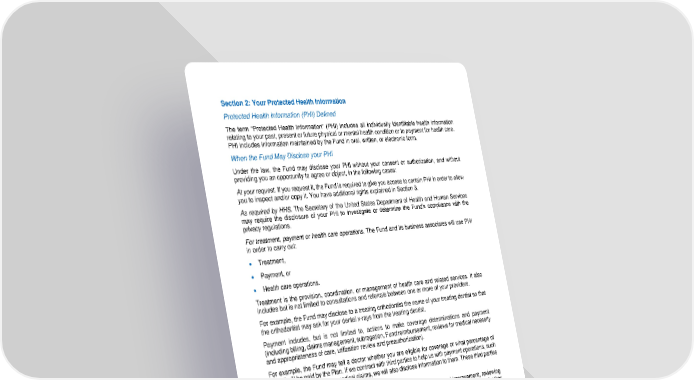 89 Section 2: Your Protected Health Information Protected Health Information (PHI) Defined The term “Protected Health Information” (PHI) include s all individually identifiable health information relating to your past, present or future physical or mental health condition or to payment for health care. PHI includes information maintained by the Fund in oral, written, or electronic form. When the Fu nd May Disclose your PHI Under the law, the Fund may disclose your PHI without your consent or authorization, and without providing you an opportunity to agree or object, in the following cases: At your request. If you request it, the Fund is required to g ive you access to certain PHI in order to allow you to inspect and/or copy it. You have additional rights explained in Section 3. As required by HHS. The Secretary of the United States Department of Health and Human Services may require the disclosure of y our PHI to investigate or determine the Fund’s complianc e with the privacy regulations. For treatment, payment or health care operations. The Fund and its business associates will use PHI in order to carry out: • Treatment, • Payment, or • Health care operations. Treatment is the provision, coordination, or management of health care and related services. It also includes but is not limited to consultations and referrals between one or more of your providers. For example, the Fund may disclose to a treat ing orthodontist the name of your treating dentist so that the orthodontist may ask for your dental x - rays from the treating dentist. Payment includes, but is not limited to, actions to make coverage determinations and payment (including billing, claims ma nagement, subrogation, Fund reimbursement, reviews for medical necessity and appropriateness of care, utilizatio n review and preauthorization). For example, the Fund may tell a doctor whether you are eligible for coverage or what percentage of the bill wil l be paid by the Plan. If we contract with third parties to help us with payment operations, such as a physician that reviews medical claims, we will also disclose information to them. These third parties are known as “business associates.” Health care op erations includes, but is not limited to, quality assessment and improvement, reviewing competence or qualifications of health care professionals, underwriting, premium rating and other insurance activities relating to creating or renewing insurance contra cts. It also includes disease management, case management, conducting or arranging for medical review, legal services, and auditing functions including fraud and abuse compliance programs, business planning and development, business management and general administrative activities. For example, the Fund may use information about your claims to refer you into a disease management program, a well - pregnancy program, project future benefit costs or audit the accuracy of its claims processing functions. Disclosu re to the Fund’s Trustees. The Fund will also disclose PHI to the Plan Sponsor, the Board of Trustees of the National IAM Benefit Trust Fund , for purposes related to treatment, payment, and health care operations, and has amended the Trust Agreement to per mit this use and disclosure as required by federal law. For example, we may disclose information to the Board of Trustees to allow them to decide an appeal or re view a subrogation claim.