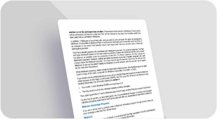 65 whether or not the participant has enrolled. This means that the benefits of Medicare Parts A and B will be estimated and benefits under this Plan will be reduced to the extent that benefits would have been paid had you en rolled in Medicare. In addition, if Medicare is the primary plan, and you elect to use a provider who does not participate in Medicare, the benefits of Medicare Parts A and B will be estimated and the benefits under this Plan will be reduced to the extent that benefits would have been paid had your provider been a Medicare participating provider. The Plan’s benefit payment will coordinate with Medicare’s payment. For covered expenses, the Plan will figure its benefit based on the total expense and then su btract the Medicare benefit and consider the balance as payable under the provisions of this Plan. For these expenses, the Plan carves out Medicare’s payment. However, federal law limits the amount a provider (Hospital, physician, etc.) can charge above th e Medicare payment. The Fund cannot pay the provider more than the amount that Medicare shows as the patient liability for Medicare covered services, and the provider cannot legally bill for more than that amount. When Medicare is primary, claims should be submitted to Medicare first. After Medicare pays the claim, submit a copy of the claim, along with the Medicare explanation of benefits, to Cigna. If you remain actively employed and you or any of your eligible Dependents become entitled to Medicare solel y because of end - stage renal disease (ESRD), this Plan pays first (Primary) and Medicare pays second (Secondary) for 30 months starting the earlier of: • T he month in which Medicare ESRD coverage begins; or • T he first month in which the individual receives a kidney transplant. Then, starting with the 31 st month, Medicare pays first (Primary) and this Plan pays second (Secondary). For the first 30 months, as described above, a ny Covered Medical Charges incurred by such disabled individual should be submitted t o this Plan for payment with any unpaid balance submitted to Medicare. Medicare Advantage Programs If you are a retiree who is covered under a Medicare Advantage program through another employer, your coverage under this Plan will terminate. Medicaid If a covered individual, active or retired, is covered by both the Plan described in the SPD and Medicaid, this Plan pays first (Primary) and Medicaid pays second (Secondary). Military Insurance Coverage The Plan does not cover dependent Spouses who are on act ive duty in any armed forces. However, if any covered individual is covered by both this Plan and Military coverage only, this Plan pays first (Primary) and the Military cove rage pays second (Secondary). Veterans Affairs Facility Services If a covered ind ividual receives services in a U.S. Department of Veterans Affairs hospital or facility on account of a military service - related illness or injury, benefits related to the illness or injury are not payable by the Plan. If a covered individual receives serv ices in a U.S. Department of Veterans Affairs hospital or facility on account of any other condition that is not a military service - related illness or injury, benefits are payable by the Plan to the extent those services are medically necessary and the cha rges are reasonable and customary.