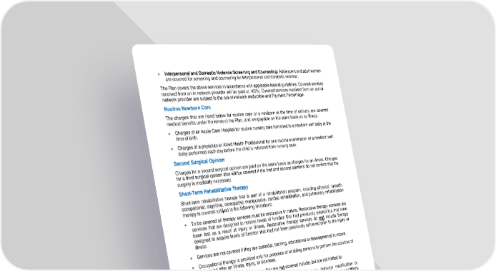52 • Interpersonal and Domestic Violence Screening and Counseling: Adolescent and adult women are cove red for screening and counseling for interpersonal and domestic violence. The Plan covers the above services in accordance with applicable federal guidelines. Covered services received from an in - network provider will be paid at 100%. Covered services rece ived from an out - of - network provider are subject to the out - of - network deductible and Payment Percentage. Routine Newborn Care The charges that are listed below for routine care of a newborn at the time of delivery are covered medical benefits under the terms of the Plan, and are payable on the same basis as an illness. • Charges of an Acute Care Hospital for routine nursery care furnished to a newborn well baby at the time of birth. • Charges of a physician or Allied Health Professional for one routine exami nation of a newborn well baby performed each day before the child is released from nursery care. Second Surgical Opinion Charges for a second surgical opinion are paid on the same basis as charges for an illness. Charges for a third surgical opinion also w ill be covered if the first and second opinions do not confirm that the surgery is medically necessary. Short - Term Rehabilitative Therapy Short - term rehabilitative therapy that is part of a rehabilitation program, including physical, speech, occupational, cognitive, osteopathic manipulative, cardiac rehabilitation, and pulmonary rehabilitation therapy is covered subject to the following limitations: • To be covered all therapy services must be restorative in nature. Restorative therapy services are services t hat are designed to restore levels of function that had previously existed but that have been lost as a result of injury or illness. Restorative therapy services do not include therapy designed to acquire levels of function that had not been previously ach ieved prior to the injury or illness. • Services are not covered if they are custodial, training, educational or developmental in nature. • Occupational therapy is provided only for purposes of enabling persons to perform the activities of daily living after a n illness, injury, or sickness. Short - term rehabilitative therapy services that are not covered include, but are not limited to: • Sensory integration therapy, group therapy; treatment of dyslexia, behavior modification or myofunctional therapy for dysfluenc y, such as stuttering or other involuntary acted conditions without evidence of an underlying medical condition or neurological disorder; • Treatment for functional articulation disorder such as correction of tongue thrust, lisp, verbal apraxia or swallowing dysfunction that is not based on an underlying diagnosed medical condition or injury ; and • Maintenance or preventive treatment consisting of routine, long term or non - medically necessary care provided to prevent recurrence, or to maintain the current statu s of the individual. If multiple outpatient services are provided on the same day, the visits will be treated as a single visit. Chiropractic treatment is not covered under the rehabilitative therapy benefits. See the section on Chiropractic Care for info rmation about Chiropractic treatment and limits. The Plan does not cover physical, speech, occupational, cognitive, osteopathic manipulative, cardiac rehabilitation, or pulmonary rehabilitation therapy except for the short - term treatment of an acute