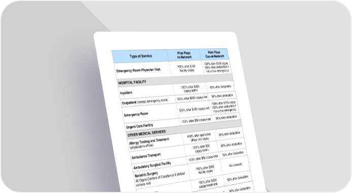 2 Type of Service Plan Pays In - Network Plan Pays Out - of - Network Emergency Room Physician Visit 100% after $100 facility copay 100% after $100 copay (50% after deductible if not a true emergency) HOSPITAL FACILITY Inpatient 100% after $350 copay /admit 50% after deductible Outpatient (except emergency room) 100% after $200 copay /visit 50% after deductible Emergency Room 100% after $100 copay /visit 100% after $100 copay (50% after deductible if not a true emergency) Urgent Care Facility 100% after $50 copay /visit 50% after deductible OTHER MEDICAL SERVICES Allergy Testing and Treatment (physician’s office) 100% after applicable office visit copay 50% after deductible Ambulance Transport 100% after $50 copay /event 50% after deductible Ambulatory Surgical Facility 100% after $50 copay /visit 50% after deductible Bariatric Surgery At Cigna Centers of Excellence if clinical criteria met 100% after $350 facility copay Not covered Chemotherapy 100% after $200 copay /treatment 50% after deductible Chiropractic Care Limit: Maximum of 20 days / calendar year 100% after $40 copay /visit 50% after deductible Diagnostic Lab (Independent Facility) 100% after $10 copay /visit 50% after deductible Diagnostic Lab (Physician’s Office) 100% after applicable office visit copay 50% after deductible Diagnostic X - ray (Ind ependent Facility) 100% after $50 copay /visit 50% after deductible Diagnostic X - ray (Physician’s Office) 100% after applicable office visit copay 50% after deductible Durable Medical Equipment Rental coverage limited to purchase price 100% after $50 copay / item 50% after deductible
