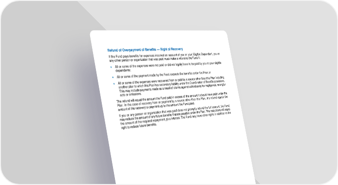 70 Refund of Overpayment of Benefits — Right of Recovery If the Fund pays benefits for expenses incurred on account of you or your Eligible Dependent, you or any other person or organization that was paid must make a refund to the Fund if: • All or some of the expenses were not paid or did not legally have to be paid by you or your eligible dependents; • All or some of the payment made by the Fund exceeds t he benefits under the Plan; or • All or some of the expenses were recovered from or paid by a source other than this Plan including another plan to which this Plan has secondary liability under the Coordination of Benefits provisions. This may include paymen ts made as a result of claims against a third party for negligence, wrongful acts or omissions. The refund will equal the amount the Fund paid in excess of the amount it should have paid under the Plan. In the case of recovery from or payment by a source other than this Plan, the refund equals the amount of the recovery or payment up to the amount the Fund paid. If you or any person or organization that was paid does not promptly refund the full amount, the Fund may reduce the amount of any future benefits that are payable under the Plan. The reductions will equal the amount of the required repayment, plus interest. The Fund may have other rights in addition to the right to reduce future benefits.