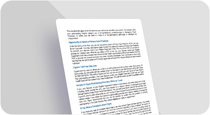 27 This standard will apply when the services you rec eive are not within your control. For example, when your participating hospital assigns you a non - participating anesthesiologist or Emergency Room Physician, or refers your lab tests or x - rays to a non - participating pathologist or radiologist for interpre tation. Opportunity to Select a Primary Care Physician Under the terms of the Plan, you are not required to select a Primary Care Physician (PCP), but may do so if you wish. You may use Cigna’s Open Access Plus network to select a Primary Care Physician fo r yourself, your Spouse, and/or your Eligible Dependent Child. The role of the PCP is to provide or arrange for medical care. Whether you select a PCP or not, you, your Spouse, and/or your Eligible Dependent child may exercise their choice of other health care providers without authorization from the PCP to provide the covered services they need, including Specialists. Each individual covered under the Plan has the right to select a PCP from Cigna’s list, and such PCP may be different for each covered indiv idual. Cigna’s Toll - Free Care Line Cigna’s toll - free care line allows you to talk to a health professional at any time, seven days a week, 24 hours a day, by calling the toll - free number shown on the back of your identification card at 800 - Cigna 24 (800 - 24 4 - 6224). The staff at Cigna’s toll - free care line can provide you with names of Open Access Plus participating providers. You, your Spouse, and/or your Eligible Dependent Child may call Cigna Health Care toll free number if you need medical care. The staff will assist you with the available options. Access to Cigna Participating Providers While on Travel If you, your Spouse, or your Eligible Dependent Children need medical care while away from home, including travel outside the U.S., you have access to a national network of participating providers through Cigna’s Away - From - Home Care feature. You can call Cigna Health Care toll free care line, 800 - Cigna 24, and the staff will provide you with names of Open Access Plus participating providers in other networ k areas. If you obtain the name of a participating provider from Cigna’s website or through the care line, Cigna recommends that you call the provider to confirm that the provider is currently participating in the Open Access Plus network before you make a n appointment. If You Have a Complaint about Cigna If you have any type of complaint about Cigna, you may contact Cigna member services. You should contact Cigna member services if you have any concerns regarding a Cigna employee, the quality of care prov ided by Cigna participating providers, or the processing of your claims (including claims for your covered family members). The toll - free number for Cigna member services is 800 - Cigna 24 (or 800 - 244 - 6224) as shown on the back of your Cigna identification c ard. You also will be able to find the Cigna number on any copy of your Explanation of Benefits (EOB) Cigna provides to you. You also have the option to express your concerns to Cigna in writing. Cigna will make every effort to resolve the concerns you rai se on your initial contact. However, Cigna may need more time to address your concerns. In this case, someone will get back to you as soon as possible, but no more than 30 days after your initial contact. The Fund Office also is available to you should yo u have any complaints about Cigna or any aspect of the administration of the Plan. You may contact the Fund Office at 202 - 785 - 8148 or toll free at 800 - 457 - 3481. Contacting Cigna member services or the Fund Office to make a complaint does not replace the r equirement that you file a written appeal if you are not satisfied with the results of a decision by Cigna on a claim you have submitted for benefits or services received under the Plan. If you do not agree with Cigna’s decision on any claim, you may conta ct Cigna member services or the Fund Office about your concerns. In addition, you must make a written request as set forth under the section governing appeals and as explained in the section “ Claims Filing and Appeal Procedures ” included in this SPD .