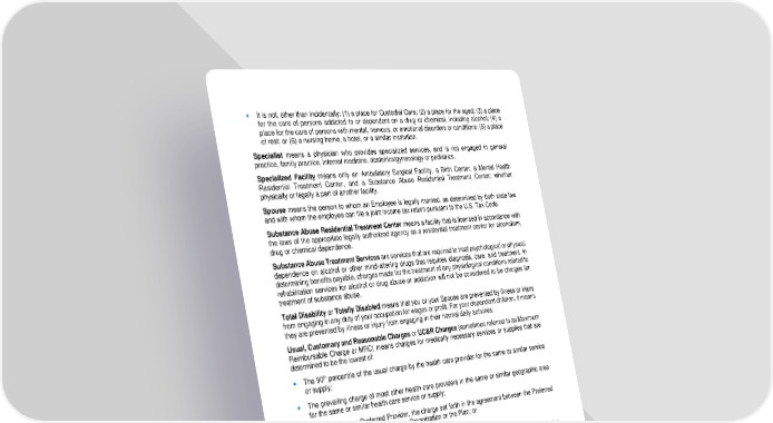 106 • It is not, other than incidentally: (1) a place for Custodial Ca re; (2) a place for the aged; (3) a place for the care of persons addicted to or dependent on a drug or chemical, including alcohol; (4) a place for the care of persons with mental, nervous, or emotional disorders or conditions; (5) a place of rest; or (6) a nursing home, a hotel, or a similar institution. Specialist means a physician who provides specialized services, and is not engaged in general practice, family practice, internal medicine, obstetrics/gynecology or pediatrics. Specialized Facility means only an Ambulatory Surgical Facility, a Birth Center, a Mental Health Residential Treatment Center, and a Substance Abuse Residential Treatment Center; whether physically or lega lly a part of another facility. Spouse means the person to whom an Employee is legally married, as determined by both state law and with whom the employee can file a joint income tax return pursuant to the U.S. Tax Code. Substance Abuse Residential Treatment Center means a facility that i s licensed in accordance with the laws of th e appropriate legally authorized agency as a residential treatment center for alcoholism, drug or chemical dependence . Substance Abuse Treatment Services are services that are required to treat psychological or physical dependence on alcohol or other mind - altering drugs that requires diagnosis, care, and treatment. In determining benefits payable, charges made for the treatment of any physiological conditions related to rehabilitation services for alcohol or drug abuse or addiction will not be considered to be charges for treatment of substance abuse. Total Disability or Totally Disabled means that you or your Spouse are prevented by illness or injury from engaging in any duty of your occupation for wages or profit. For your dependent child ren , it means they are prevented by illness or injury from engaging in their normal daily activities. Usual, Customary and Reasonable Charges or UC&R Charges (sometimes referred to as Maximum Reimbursable Charge or MRC) mean s charges for medically necessary se rvices or supplies that are d etermined to be the lowest of: • The 90 th percentile of the usual charge by the health care provider for the same or similar service or supply; • The prevailing charge of most other health care providers in the same or similar geog raphic area for the same or similar health care service or supply; • With respect to a Preferred Provider, the charge set forth in the agreement between the Preferred Provider and the Preferred Provider Organization or the Plan; or • The health care provider’s actual charge. You and your means the employee/participant who is eligible for coverage under the terms of the plan and who can enroll his or her Spouse and/or eligible dependent children.
