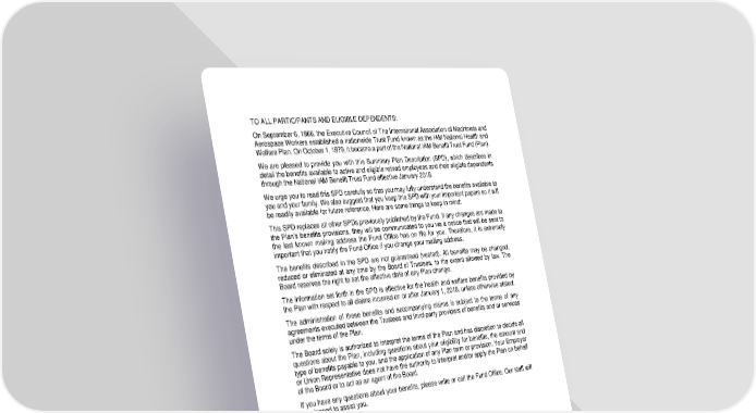 ii TO ALL PARTICIPANTS AND ELIGIBLE DEPENDENTS: On September 6, 1966, the Executive Council of The International Association of Machinists and Aerospace Workers established a nationwide Trust Fund known as the IAM National Health and Welfare Plan. On October 1, 1979, it became a part of the National IAM Benefit Trust Fund (Plan). We are pleased to provide you with this Summary Plan Description (SPD), which describes in detail t he benefits available to active and eligible retired employees and their eligible dependents through the National IAM Benefit Trust Fund effective January 2018 . We urge you to read this SPD carefully so that you may fully understand the benefits available to you and your family. We also suggest that you keep this SPD with your important papers so it will be readily available for future reference. Here are some things to keep in mind: This SPD replaces all other SPDs previously published by the Fund. If any changes are made to the Plan’s benefits provisions, they will be communicated to you via a notice that will be sent to the last known mailing address the Fund Office has on file for you. Therefore, it is extremely important that you notify the Fund Office if you change your mailing address. The benefits described in the SPD are not guaranteed (vested). All benefits may be changed, reduced or eliminated at any time by the Board of Trustees, to the extent allowed by law. The Board reserves the right to set t he effective date of any Plan change. The information set forth in the SPD is effective for the health and welfare benefits provided by the Plan with respect to all claims incurred on or after January 1, 2018 , unless otherwise stated. The administration o f these benefits and accompanying claims is subject to the terms of any agreements executed between the Trustees and third - party providers of benefits and or services under the terms of the Plan . The Board solely is authorized to interpret the terms of th e Plan and has discretion to decide all questions about the Plan, including questions about your eligibility for benefits, the amount and type of benefits payable to you, and the application of any Plan term or provision. Your Employer or Union Represe nt at ive does not have the authority to interpret and/or apply the Plan on behalf of the Board or to act as an agent of the Board. If you have any questions about your benefits, please write or call the Fund Office. Our staff will be pleased to assist you. Sinc erely, THE BOARD OF TRUSTEES