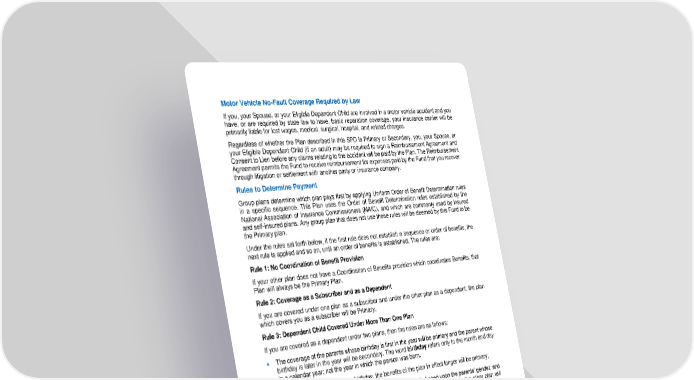 65 Motor Vehicle No - Fault Coverage Required b y Law If you, your Spouse, or your Eligible Dependent Child are involved in a motor vehicle accident and you ha ve, or are required by state law to have, basic reparation coverage, your insurance car rier will be primarily liable for lost wages, medical, surgical, hospital, and related charges. Regardless of whether the Plan described in this SPD is Primary or Second ary, you, your Spouse, or your Eligible Dependent Child (if an adult) may be required to sign a Reimbursement Agreement and Consent to Lien before any claims relating to the accident will be paid by the Plan. The Reimbursement Agreement permits the Fund to receive reimbursement for expenses paid by the Fund that you recover through litigation or settlement with another party or insurance company. Rules to Determine Payment Group plans determine which plan p ays first by applying Uniform Order of Benefit Dete rmination rules in a specific sequence. This Plan uses the Order of Benefit Determinati on rules established by the National Association of Insurance Commissioners (NAIC), and which are commonly used by insured and self - insured plans. Any group plan that do es not use these rules will be deemed by this Fund to be the Primary plan. Under the ru les set forth below, if the first rule does not establish a sequence or order of benefits, the next rule is applied and so on, until an order of benefits is established. The rules are: Rule 1: No Coordination of Benefit Provision If your other plan does not have a Coordination of Benefits provision which coordinates Benefits, that Plan will always be the Primary Plan. Rule 2: Coverage as a Subscriber and as a Dependent If you are covered under one plan as a subscriber and under the other plan as a dependent, the plan which covers you as a subscriber will be Primary. Rule 3: Dependent Child Covered Under More Than One Plan If you are covered as a dependent under two plans, then the rules are as follows: • The coverage of the parents whose birthday is first in the year will be primary and the parent whose birthday is later in the year will be secondary. The word birthday refers only to the month and day in a calendar year; not the year in which the person was born. • If both parents have the same birthday, the benefits of the plan in effect longer will be primary; • If the other plan does not have this rule, but instead has a rule based upon the parents’ gender; and if as a result, the plans do not agree on the order of benefits, then the rule in the other plan will determine the order of pa yment for the claimed benefits. Rule 4: For a Child of Separated or Divorced Parents: • I f t he terms of a court decree specify which parent is responsible for the health care coverage and expenses of the child, and that parent’s p lan has actual knowledge of the Court Order, then that parent’s plan shall be primary. • If no such court decree exis ts, or if the plan of the parent designated under such a court decree as responsible for the child’s health care coverage and expenses does n ot have actual knowledge of the court decree, benefits for the child are determined in the following order: First, the plan of the parent with custody of the child; Then, the plan of the Spouse of the parent with custody of the child; Finally, the plan of the parent not having custody of the child.