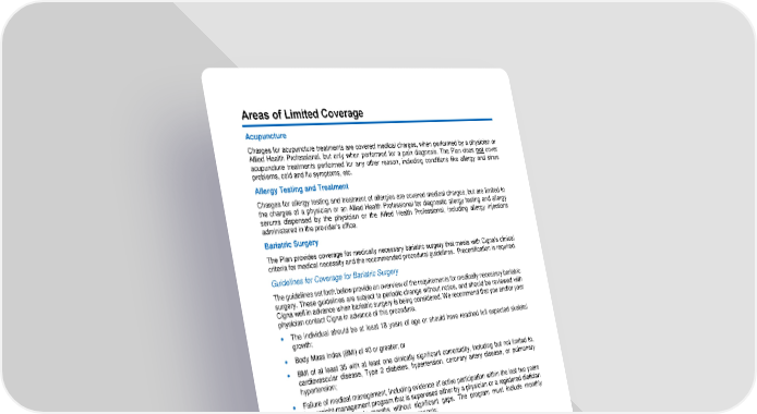36 Areas of Limited Coverage Acupuncture Charges for acupuncture treatments are covered medical charges, when performed by a physician or Allied Health Professional, but only when performed for a pain diagnosis. The Plan does not cover acupuncture treatments performed for a ny other reason, including conditions like allergy and sinus problems, cold and flu symptoms, etc. Allergy Testing and Treatment Charges for allergy testing and treatment of allergies are covered medical charges, but are limited to the charges of a physician or an Allied Health Professional for diagnostic allergy testing and allergy serums dispensed by the physician or th e Allied Health Professional, including allergy injections administered in the provider’s office. Bariatric Surgery The Plan provides coverage for medically necessary bariatric surgery that meets with Cigna’s clinical criteria for medical necessity and th e recommended procedural guidelines. Precertification is required. Guidelines for Coverage for Bariatric Surgery The guidelines set forth below provide an overview of the requirements for medically necessary bariatric surgery. These guidelines are subject to periodic change without notice, and should be reviewed with Cigna well in advance when bariatric surgery is be ing considered. We recommend that you and/or your physician contact Cigna in advance of this procedure. • The individual should be at least 18 years of age or should have reached full expected skeletal growth; • Body Mass In dex (BMI) of 40 or greater; or • BMI of at least 35 with at least one clinically significant comorbidity, including but not limited to, cardiovascular disease, Type 2 diabetes, hypertension, coronary artery disease, or pulmonary hypertension ; • Failure of medical management, including evidence of active participation within the last two years in a weight - management program that is supervised either by a physician or a registered dietician for a min imum of six months without significant gaps. The program must include monthly documentation of ALL of the following components: Weight; Current dietary program; and Physical activity (e.g., exercise program). Programs such as Weight Watchers ® , Jenny Craig ® , and Optifast ® are acceptable alternatives if done in conjunction with the supervision of a phys ician or a registered dietician, and detailed documentation of participation is available for review. For individuals with long - standing morbid obesity, participation in a program within the last five years is sufficient if reasonable attendance in the wei ght - management program over an extended period of time of at least six months can be demonstrated. Note : Physician - supervised programs consisting exclusively o f pharmacological management are not sufficient to meet this requirement.