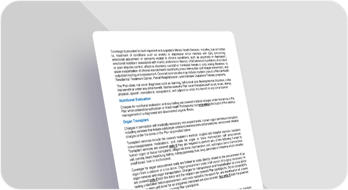 42 Coverage is provided for both inpatient and outpatient Mental Health Services, including, but not limited to, treatment of conditions such as anxiety or depression which interfere with daily functioning; emotional adjustment or concerns related to chronic conditions, such as psychosis or depression; emotional reactions associated with marital problems or divorce; child/adolescent problems of conduct or po or impulse control; affective disorders; suicidal or homicidal threats or acts; eating disorders; or acute exacerbation of chronic mental health conditions (crisis intervention and relapse prevention), and outpatient testing and assessment. Covered service s also may include inpatient care at a Mental Health Residential Treatment Center, Partial Hospitalization, and Intensi ve Outpatient Therapy programs. The Plan does not cover diagnoses such as learning, behavioral and de velopmental disorders under this ben efit or under any other benefit. Neither does the Plan cover therapies such as art, music, drama, physical, speech, recreational, occupational, and adjunctive under thi s benefit or any other benefit. Nutritional Evaluation Charges for nutritional evaluati on and counseling are covered medical charges under the terms of the Plan when ordered by a physician or Allied Health Professional, but only when diet is part of the medical management of a diagnosed and documented orga nic illness. Organ Transplant Charg es in connection with medically necessary, non - experimental, human organ and tissue transplant, including services that include solid organ and bone marrow/stem cell procedures, are covered medical charges under the terms of the Plan as provided below: Tra nsplant services include the covered recipient’s medical, surgical and Hospital services; inpatient immunosuppressive medications; and costs for organ or bone marrow/stem cell procurement. Transplant services are covered only if they are required to perfor m any of the following human to human organ or tissue transplants; allogeneic bone marrow/stem cell, autologous bone marrow/stem cell, cornea, heart, heart/lung, kidney, kidney/pancreas, liver, lung, pancreas or intestin al which includes small bowel, liver or multivi sceral. Coverage for organ procurement costs are limited to costs directly related to the procurement of an organ from a cadaver or a live donor. Organ procurement costs shall consist of surgery necessary for organ removal and organ transportati on. Charges for transportation and hospitalization of a live donor are covered only if both the donor and the recipient are covered Plan participants. Donor compatibility testing undertaken before procurement, and costs related to the search for, and ident ification of, a bone marrow or stem cell donor for an allogeneic transplant are also covered, but only if both the potential donor and the recipient are covered Plan participants. Podiatry Care The charges for podiatry care that are covered medical charge s include medically necessary services of a podiatrist acting within the scope of his or her license. For example, podiatry care includes charges for the diagnosis and treatment of chronic foot pain; instability or imbalance of the feet; foot deformities; and toenail infections. Podiatry care also includes the charge for custom molded orthotics, but does not include the charge for shoes or pre - fabricated shoe inserts. The podiatry care benefit does not cover routine foot care such as paring and removal of c orns and calluses, or trimming of toenails. However, services associated with foot care for diabetes and peripheral vascular disease are covered medical charges when medically necessary under the terms of the Plan. Podiatry care is limited to 30 - days maxim um per calendar year, regardless of the service provider. Benefits for medically necessary surgery are not subject to the 30 - days limitation, but are payable on the same basis as benefits for any other covered surgery.