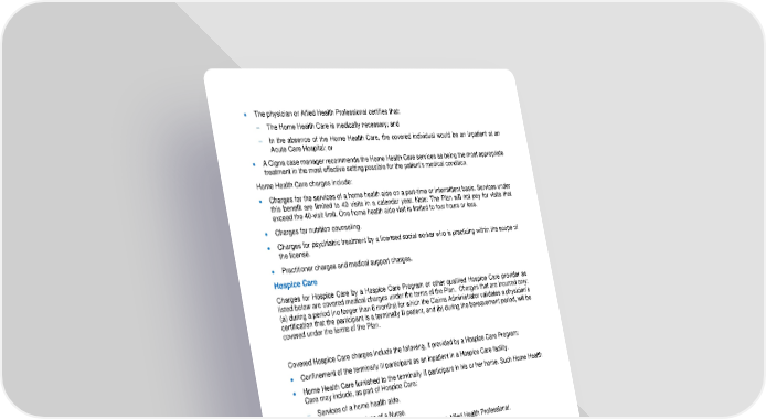 39 • The physician or Allied Health Professional certifies that: The Home Health Care is medically necessary; and In the absence of the Home Health Care, the covered individual would be an inpatient at an Acute Care Hospital; or • A Cigna case manager recommends the Home Health Care services as being the m ost appropriate treatment in the most effective setting possible for the patient’s medical condition. Home Health Care charges include: • Charges for the services of a home health aide on a part - time or intermittent basis. Services under this benefit are lim ited to 40 visits in a calendar year. Note: The Plan will not pay for visits that exceed the 40 - visit limit. One home health aide visit is limited to four hours or less. • Charges for nutrition counseling. • Charges for psychiatric treatment by a licensed soci al worker who is practicing within the scope of the license. • Practitioner charges and medical support charges. Hospice Care Charges for Hospice Care by a Hospice Care Program or other qualified Hospice Care provider as listed below are covered medical charges under the terms of the Plan. Charges that are incurred only: (a) during a period (no longer than 6 months) for which the Claims Admi nistrator validates a physician’s certification that the participant is a terminally ill patient, and (b) during th e bereavement period, will be covered under the terms of the Plan. Covered Hospice Care charges include the following, if provi ded by a Hospice Care Program: • Confinement of the terminally ill participant as an inpatient in a Hospice Care facility. • Home H ealth Care furnished to the terminally ill participant in his or her home. Such Home Health Care may include, as part of Hospice Care: Services of a home health aide. Professional services of a Nurse. Physical therapy or other therapy furnished by an Allie d Health Professional. Charges for nutrition counseling and special meals. Medical Support Charges. • Charges for medical social services furnished to the terminally ill participant or to the participant’s family unit. • Charges for bereavement counseling fur nished to the terminally ill participant’s family unit during the bereavement period, up to three (3) individual or family sessions for all members of the terminally ill participant’s family unit. • Inpatient Respite Care is limited to eight (8) days per li fetime. For Hospice Care only, the terms of the medical coverage are modified as set forth below to enable Hospice Care charges to meet the definition of covered medical charges: • The exclusion for Custodial Care does not apply.