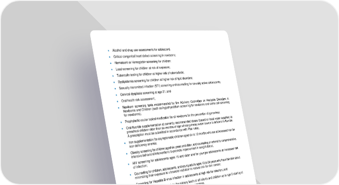 47 • Alcohol and drug use assessmen ts for adolescent • Critical congenital heart defect screening in newborns; • Hematocrit or Hemoglobin screening for children; • Lead screening for children at risk of exposure; • Tuberculin testing for children at higher risk of tuberculosis; • Dyslipidemia screeni ng for children at higher risk of lipid disorders; • Sexually transmitted infection (STI) screening and counseling for sexually active adolescents; • Cervical dysplasia screening at age 21; and • Oral health risk assessment; • Newborn screening tests recommended b y the Advis ory Committee on Heritable Disorders in Newborns and C hildren (such as hypothyroidism screening for newborns and sickle cell screening for newborns); • Prophylactic ocular topical medication for all newborns for the prevention of gonorrhea; • Oral f luoride supplementation at currently recommended doses (based on local water supplies) to preschool children older than six months of age whose primary water source is deficient in fluoride. A prescription must be submitted in accordance with Plan rules; • I ron supplementation for asymptomatic children aged six to 12 months who are at increased risk for iron deficiency anemia; • Obesity screening for children aged six years and older, and counseling or referral to comprehensive, intensive behavioral interventio ns to promote improvement in weight status; • HIV screening for adolescents ages 15 and older and for younger adolescents at increased risk of infection; • Counseling for children, adolescents, and young adults ages 10 to 24 years who have fair skin about min imizing their exposure to ultraviolet radiation to reduce risk for skin cancer; • Screening for H epatitis B virus infection in adolescents at high risk for infection; and • Application of fluoride varnish to the primary teeth of all infants and children up to age 5 starting at the age of primary tooth eruption, in primary care practices. Immunizations • Routine adult immunizations are covered for you, your spouse, and dependent children who meet the age and gender requirements, and who meet the CDC medical criter ia for recommendation. Immunizations administered for travel are excluded. • Immunization vaccines for adults — doses, recommended ages and recommended populations must be satisfied: Diphtheria/tetanus/pertussis; Measles/mumps/rubella (MMR); Influenza; Huma n papilloma virus (HPV); Pneumococcal (polysaccharide);