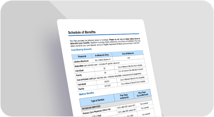 1 Schedule of Benefits The Plan provides the following levels of coverage. Please do not rely on these tables alone to determine your benefits . Important coverage details, limitations, exclusions and definitions that may affect claims for you, your Spouse, and your Eligible Dependent Children are found later in this SPD. Cost - Sharing Amounts Medical Benefits Type of Service Plan Pays In - Network Plan Pays Out - of - Network PHYSICIAN SERVICES Primary Care Physician Office Visit 100% after $30 c opay /visit Not covered Specialist Office Visit 100% after $50 copay /visit Not covered Surgical Professional Fees (inpatient) Surgeon, Assistant Surgeon, Anesthesiologist 100% after $500 facility copay Not covered Inpatient Hospital Visit 100% after $500 facility copay Not covered Observation Visit 100% after $500 facility copay Not covered Urgent Care Physician Visit 100% after $50 facility copay Not covered Emergency Room Physician Visit 100% after $200 facility copay 100% after $200 facility copay ( not covered if not a true emergency) Financial In - Network Only Ou t - of - Network Lifetime Maximum No Lifetime Maximum N/A Deductible (per calendar year – includes 4 th quarter carryover) Individual $0 Out - of - Network Benefits Not Available Family $0 Out – of - Network Benefits Not Available Out - of - Pocket Limit (per calendar year – includes deductible, coinsurance and copayments) Individual $6,000 Out - of - Network Benefits Not Available Family $12,000 Out - of - Network Benefits Not Available