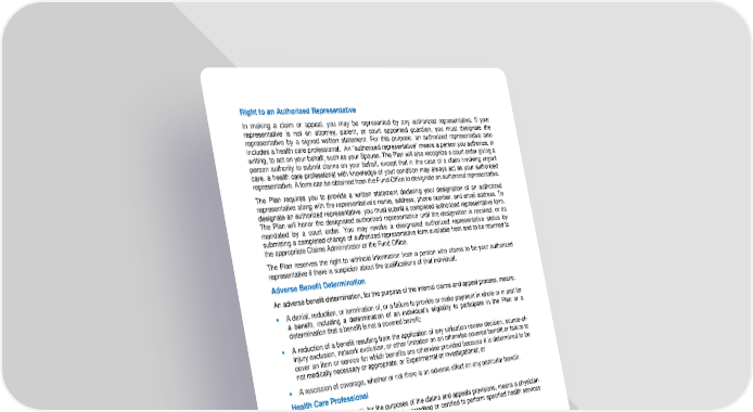72 Right to an Authorized Representative In making a claim or appeal, you may be represented by any authorized representative. If your representative is not an attorney, parent, or court appointed guardian, y ou must designate the representative by a signed written statement. For this purpose, an authorized representative also includes a health care professional. An “authorized representative” means a person you authorize, in writing, to act on your behalf, such as your Spouse. The Plan will also recognize a court order giving a person authority to submit claims on your behalf, except that in the case of a claim involving urgent care, a health care professional with knowledge of your condition may always act as your authorized representative. A form can be obtained from the Fund Office to designate an authorized representative. The Plan requires you to provide a written statement declaring your designation of an authorized representative along with the represe ntative’s name, address, phone number, and email address. To designate an authorized representative, you must submit a completed authorized representative form. The Plan will honor the designated authorized representative until the designation is revoked, or as mandated by a court order. You may revoke a designated authorized representative status by submitting a completed change of authorized representative form available from and to be returned to the appropriate Claims Administrator or the Fund Office. The Plan reserves the right to withhold information from a person who claims to be your authorized representative if there is suspicion about the qualifications of that individual. Adverse Benefit Determination An adverse benefit determination, for the pu rpose of the internal claims and appeal process, means: • A denial, reduction, or termination of, or a failure to provide or make payment in whole or in part for a benefit, including a determination of an individual’s eligibility to participate in the Plan o r a determination that a benefit is not a covered benefit; • A reduction of a benefit resulting from the application of any utilization review decision, source - of - injury exclusion, network exclusion, or other limitation on an otherwise covered benefit or fa ilure to cover an item or service for which benefits are otherwise provided because it is determined to be not medically necessary or appropriate, or Experimental or Investigational; or • A rescission of coverage, whether or not there is an adverse effect on any particular benefit. Health Care Professional A healt h care professional, for the purposes of the claims and appeals provisions, means a physician or other health care professional licensed, accredited or certified to perform specified health serv ices consistent with state law. Definition of a Claim A claim is a request for a Plan benefit made by you, your Spouse, or your covered Dependent Child (also referred to as “claimant”) or your authori zed representative in accordance with the Plan’s reasonable claims procedures. Casual inquiries about benefits or the circumstances under which benefits might be paid according to the terms of the Plan are not considered claims. Nor is a request for a det ermination of whether an individual is eligible for benefits under the Plan considered to be a claim. However, if a claimant files a claim for specific benefits and the claim is denied because the individual is not eligible for benefits under the Plan, the coverage determination is consi dered a claim. A request for prior approval of a benefit that does not require prior approval by the Plan is not considered a claim. However, requests for prior approval of a benefit where the Plan does require prior approva l (e.g., hospital pre - admission certification, etc.) are considered claims and should be submitted as pre - service claims (or urgent claims, if applicable), as described in the following procedures.