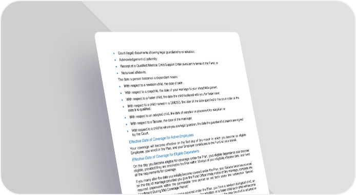10 • Court (legal) documents showing legal guardianship or adoption; • Acknowledgement of paternity; • Receipt of a Qualified Medical Child Support Order pursuant to terms of the Fund; or • Notarized affidavits. The date a person becomes a dependent means: • With respect to a newborn child, the date of birth; • With respect to a stepchild , the date of your marriage to your stepchild ’s parent; • With respect to a foster child, the date the child is placed with you for foster care; • With respect to a child named in a QMCSO, the later of the date specified in the court order or the date it is qualified; • With respect to an adopted child, the date of adoption or placement for adoption; or • With respect to a Spouse, the date of the marriage; • With respect to a ch ild for whom you are legal guardian, the date the guardianship papers are signed by the Court . Effective Date of Coverage for Active Employees Your coverage will become effective on the first day of the month in which you become an eligible Employee, you enroll in the Plan, and your Employer contributes to the Fund on your behalf. Effective Date of Coverage for Eligible Dependents On the day you become eligible for coverage under the Plan, your eligible dependents also become eligible, provide d they are en rolled in the Plan within 30 days of your eligibility effective date, and meet all the requirements for coverage. If you marry after the date you initially become covered under the Plan, your Spouse becomes covered on the day of marriage provided you give the Fund Office timely notice of the marriage, complete the required paperwork within the permissible time period as set forth under the subsection “Special Enrollment During Mid - Coverage Period.” If, after the date you initially become covered under the P lan, you have a newborn biological child, an adopted child, a stepchild, a child placed with you for adoption, or a foster child such child will become covered on the date of their birth (for a newborn biological child) or on the date the child is adopted or placed in your home (for step, adopted, or foster children). To ensure a new dependent receives coverage, you must notify the Fund Office within 30 calendar days of the date you acquire a new dependent through marriage, birth, foster placement, or adopt ion. You must also submit all required paperwork, and your Employer must make the required contribution for dependent coverage (e.g. Employee plus Spouse, Employee plus children, family). Determination of Eligibility for Coverage Your eligibility for cove rage under this Plan is determined each month, based on the contributions received from your employer. After the initial determination of your eligibility, your eligibility and coverage will terminate on the last day of any month in which you no longer qua lify as an Employee, and your employer does not remit the required contribution for your coverage.