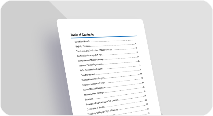 iv Table of Contents Schedule of Benefits ................................ ................................ ................................ ....... 1 Eligibility Provisions ................................ ................................ ................................ ......... 6 Termin ation and Continuation of Health Coverage ................................ ........................ 13 Continuation Coverage (Self - Pay) ................................ ................................ ................. 16 Comprehensive Medical Coverage ................................ ................................ ................ 24 Preferred Provider Organization ................................ ................................ .................... 26 PHS+ Precertification Program ................................ ................................ ...................... 28 Case Management ................................ ................................ ................................ ........ 30 Disease Management Program ................................ ................................ ..................... 31 Employee Assistance Program ................................ ................................ ..................... 32 Covered Medical Charges List ................................ ................................ ...................... 33 Areas of Limited Coverage ................................ ................................ ............................ 36 Exclusions ................................ ................................ ................................ ..................... 53 Prescription Drug Coverage — CVS Caremark ................................ ............................... 56 Coordination of Benefits ................................ ................................ ................................ 62 Thir d - Party Liability and Right of Recovery ................................ ................................ .... 67 Claims Filing and Appeal Procedures ................................ ................................ ............ 71 Miscellaneous Provisions and Cost Savings Advice ................................ ...................... 85 General Benefit Provisions ................................ ................................ ............................ 94 General Information ................................ ................................ ................................ ....... 95 Glossary ................................ ................................ ................................ ...................... 100 Statement of ERISA Rights ................................ ................................ ......................... 107