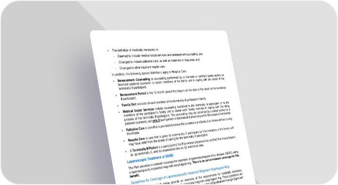 40 • The definition of medically necessary is: Deemed to include medical social services and bereavement counseling; and C hanged to include palliative care, as well as treatment or diagnosis; and Changed to allow inpatient respite care. In addition, the following special definitions apply to Hospice Care: • Bereavement Counseling is counseling performed by a licensed or certified social worker or licensed pastoral counselor to assist members of the family unit in coping with the death of the terminally ill participant. • Bereavement Period is the 12 - month period that begins on the date of the death of the terminally ill participant. • Family Unit consists of each member of the terminally ill participant’s family. • Medical Social Services include counseling furnished to the terminally ill parti cipant or to the members of the participant’s family unit to assist each family member in coping with the dying process of the terminally ill participant. The counseling may be furnished by a social worker or a pastoral counselor, but only if such person i s licensed and practicing w ithin the scope of the license. • Palliative Care is care that is provided to relieve the symptoms or effects of an illn ess without curing the illness. • Respite Care is care that is given to a terminally ill participant so that members of the family unit may have relief from the stress of caring for the terminally ill participant. • A Terminally Ill Patient is a participant of the Plan whose physician has certified that the participant is: (a) terminally ill, and (b) expected to live six (6) months or less. Laparoscopic Treatment of GERD The Plan provides in - network coverage for treatment of gastroesophageal reflux disease (GERD) using a laparoscopically implanted magnet ic esophageal ring. There is no out - of - network coverage for this benefit. Guidelines for Coverage of Laparoscopically Implanted Magnetic Esophageal Ring The guidelines set forth below provide an overview of the requirements for medically necessary treatmen t of GERD using a laparoscopically implanted magnetic esophageal ring. These guidelines are subject to periodic change without notice, and prior authorization should be obtained through Cigna well in advance when this treatment option is being considered. • The individual has been diagnosed with severe GERD, as documented by endoscopy. If endoscopy is normal, objective evidence of reflux should include at least one of the following: 24 - hour ambulatory esophageal pH monitoring; or Barium swallow study; and • The individual continues to have chronic GERD symptoms that have been resistant to conservative medical treatment and unresponsive to two or more of the following lifestyle modifications: Weight loss for overweight or obese patients; or Avoidance of late meals and/or specific foods that cause heartburn (spicy foods, citrus, fatty foods, chocolate, caffeine, carbonated drinks, alcohol, etc.); or