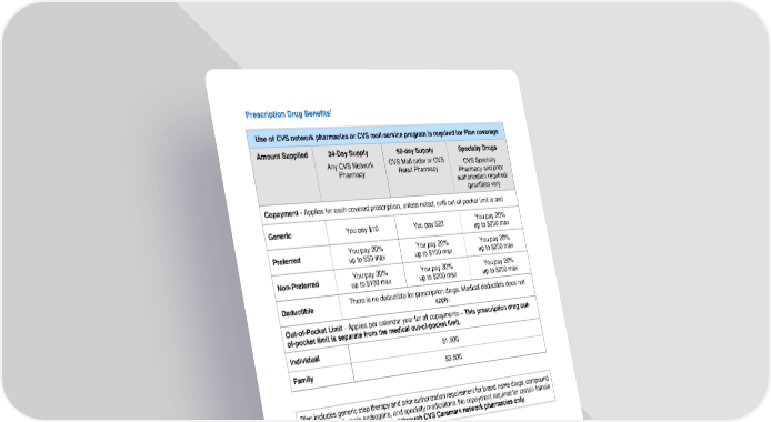 5 Prescription Drug Benefit s 1 Use of CVS network pharmacies or CVS mail - service program is required for Plan coverage Amount Suppl ied 34 - D ay S upply Any CVS Network Pharmacy 90 - day Supply CVS Mail order or CVS Retail Pharmacy Specialty Drugs CVS S pecialty P harmacy and pr ior authorization required; quantities vary Copayment - Applies for each covered prescription, unless noted, until out - of - pocket limit is met Generic You pay $10 You pay $20 You pay 20% up to $200 max Preferred You pay 20% up to $50 max You pay 20% up to $100 max You pay 20% up to $200 max Non - Preferred You pay 30% up to $100 max You pay 30% up to $200 max You pay 20% up to $200 max Deductible There is no deductible for prescription drugs. M edical deductible does not apply . Out - of - Pocket Limit - Applies per calendar year for all copayments – This prescription drug out - of - pocket limit is separate from the medical out - of - pocket limit . Individual $1,900 Family $3,800 Plan includes generic step therapy and prior authorization requirement for brand name drugs, compound drugs over $300, male androgens, and specialty medications. No copayment required for certain female contraceptives. Coverage provided through CVS Carema rk network pharmacies only . 1 N ote that under the medical benefits , the schedule reflects what the plan will pay. However, under prescription drug s , the schedule reflects what you will pay per prescription fill for all plan options.