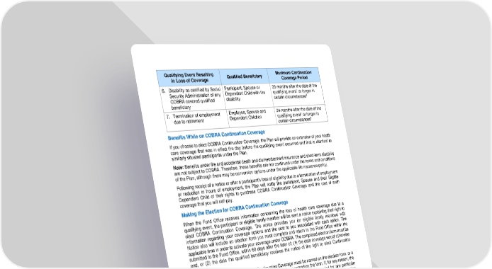 21 Qualifying Event Resulting i n Loss of Coverage Qualified Beneficiary Maximum Continuation Coverage Period 6. Disability as certified by Social Security Administration of any COBRA covered qualified beneficiary Participant, Spouse or Dependent Child with the disability 35 months after t he date of the qualifying event 1 or longer in certain circumstances 2 7. Termination of employment due to retirement Employee , Spouse and D ependent Children 24 months after t he date of the qualifying event 1 or longer in certain circumstances 3 Benefit s While on COBRA Continuation Coverage If you choose to elect COBRA Continuation Coverage, the Plan will provide an extension of your health care coverage that was in effect the day before the qualifying event occurred and that is identical to similarly situated participants under the Plan. No te: Benefits under life and accidental death and dismemberment insurance and short - term disability are not subject to COBRA. Therefore, these benefits are not continued under the terms and conditions of the Plan, although there may be conversion options un der the applicable life insurance policy. Following receipt of a notice or after a participant’s loss of eligibility due to a termination of employment or reduction in hours of employment, the Plan will notify the participant, Spouse and their Eligible Dep endent Child of their rights to purchase COBRA Continuation Coverage and the cost of such coverage that you will self - pay . Making the Election for COBRA Continuation Coverage When the Fund Office receives information concerning the loss of health care cove rage due to a qualifying event, the participant or eligible family member will be sent a notice explaining their right to elect COBRA Continuation Coverage. The notice provides you (or elig ible family member) with information regarding your coverage option s and the cost to you associated with each option. The Notice also will include an election form you must complete and return to the Fund Office within the applicable time in order to activate your coverage under COBRA. The completed election form must be submitted to the Fund Office, within 60 days after the later of; (1) the date coverage would otherwise end, or (2) the date the qualified beneficiary receives the notice of the right to elect Continuation Coverage. Each qualified beneficiary who elects Continuation Coverage must be named on the election form, or a separate election form must be submitted for any person not named on the form. If, for any reason, the Fund Office does not receive a completed election form within the 60 - day period for any pa rticular qualified beneficiary, the eligibility period for that qualified beneficiary to elect COBRA Continuation Coverage will expire and his or her health benefits will terminate as of the date on which he or she first became a qualified beneficiary (i.e ., when coverage under the Plan terminated) . Neither the Fund Office nor the Plan will be responsible if a parent or guardian, acting on behalf of a minor qualified beneficiary, does not inform the minor qualified beneficiary of his or her right to elect COBRA Continuation Cov erage within the 60 - day period. 1 This 24 - month maximum period includes the 18 - month statutory COBRA period plus an additional 6 months self - pay, as provided under the Pla n. 2 Refer to above section concerning COBRA Continuation Coverage and Disability 3 The length of the COBRA Continuation Coverage will depend on whether the participant applies for Medicare before or after beginning COBRA Continuation Coverage.