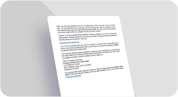 108 rights, you may seek assistance from the U.S. Department of Labor, or you may file suit in a federal court. The court will decide who should pay court costs and legal fees. If you are successful, the court may order the person you have sued to pay these costs and fees. If you lose, the court may order you to pay these costs and fees, for exampl e, if it finds your claim is frivolous. However, in al l cases including those described in the above paragraph, you must first exhaust your administrative remedies under the Plan (by following the claims and appeals procedures described in the SPD) before you may file suit in any court. Assistance with Questions If you have any questions about your Plan (for example, any questions about the processing of your claims, or allo wances considered by the Plan, covered expenses, or questions regarding your eligibi lity), you should contact the Plan Administrator. If you have any questions about this statement or about your rights under ERISA, you should contact the nearest office of the Employee Benefits Security Administration, U.S. Department of Labor, listed in your telephone directory or write to the EBSA’s Office of Assistance: Office of Participant Assistance Employee Benefits Security Administration U.S. Department of Labor 200 Constitution Avenue, NW, Suite N - 5625 Washington, DC 20210 You may also obtain ce rtain publications about your rights and responsibilit ies under ERISA by calling EBSA’s Toll - Free Employee & Employer Hotline at (866) 444 - EBSA (3272) or visit the EBSA website at www.dol.gov/dol/ebsa .
