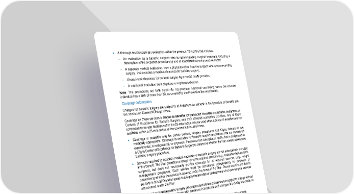 37 • A thorough multidisciplinary evaluation within the previous 12 - months that includes: An evaluation by a bariatric surgeon who is recommending surgical treatment, including a descript ion of the proposed procedure(s) and all associated current procedure codes; A separa te medical evaluation, from a physician other than the surgeon who is recommending surgery, that includes a medical clearance for bariatric surgery; Unequivocal clearance for bariatric surgery by a mental health provider; A nutritional evaluation by a phys ician or registered dietician. Note : The procedures set forth herein do not preclude nutritional counseling where the covered individual has a BMI of more than 30, as cove red by the Preventive Services benefit. Coverage Information Charges for bariatric su rgery are subject to all limitations as set forth in the Schedule of Benefits and the section on Covered Charge Limits. Coverage for these services is limited to benefits for contracted Hospitals and facilities designated as Centers of Excellence for Bariatric Surgery, and their affiliated contracted providers . Any of Cigna contracted three - star facilities within the 25 - mile radius may be used when a center of excellence is not available within a 25 - mile radius of the covered individual’ s home. • Coverag e is available only for certain bariat ric surgery procedures that Cigna determines are medically appropriate. Coverage is excluded for bariatric surgery procedures that are considered experimental, investigational, or unproven. Please contact a hospital or facility that is designated as a Cigna Center of Excellence for Bariatric Surgery to determine whether the Plan covers a propos ed bariatric surgery procedure. • Services required to establish medical necessity of bariatric surgery are not automatically incl uded in this benefit. The Plan provides coverage for some required services (e.g., evaluation by a bariatric surgeon), but does not necessarily provide coverage for all required services (e.g., weight management programs). Each service must be considered i ndependently for purposes of determining whether the service is covered under the terms of the Plan. Please examine the details set forth in this SPD and/or speak to a Cigna representative to determine which pre - surgical services are covered under the Plan . Covered and excluded bariatric surgery procedures and clinical guidelines are subject to change without notice, as appropriate, in accordance with advances in treatment and changes in industry standards as Cigna determines. Please ask your physician to c ontact Cigna well in advance of any proposed bariatric surgery. Chiropractic Care Charges for chiropractic services are covered medical charges provided that: (a) the services are medically necessary treatment of musculoskeletal disease or injury, and (b) the services are restorative in nature, designed to restore levels of function that had previously existed but that have been lost due to injury or illness. Restorative therapy services do not include therapy designed to acquire levels of function that had not been previously achieved prior to the injury or illness. The Plan will not pay for any type of: (a) maintenance or preventive treatment, (b) services that are considered custodial, training, developmental or educational in nature, (c) vitamin therapy , (d) massage therapy, or (e) for medical equipment and supplies provided in connecti on with chiropractic services. Days Limitation: Chiropractic Care benefits are limited to 20 days per calendar year.