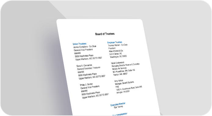 i Board of Trustees Union Trustees Employer Trustees James Conigliaro - Co - Chair General Vice President I AMAW 9000 Machinists Place Upper Marlboro, MD 20772 - 2687 Thomas Mitchell - Co - Chair President Allen - Mitchell & Co. 515 V Street , NE Washington, DC 20002 Dora H. Cervantes General Secretary Treasurer IAMAW 9000 Machinists Place Upper Marlboro, MD 20772 - 2687 Marie Underwood Managing Director Finance & Controller McGee Air Services 901 Powell Ave, SW, Suite 100 Renton, WA 98057 Philip J. Gruber General Vice President IAMAW 9000 Machinists Place Upper Marlboro, MD 20772 - 2687 Amy Kehoe Manager, Benefit Systems PAE 1320 N. Courthouse Road, Suite 800 Arlington, VA 22201 Executive Director Ryk Tierney Plan Administrator Board of Trustees Consultants and Actuaries The Segal Group Fund Counsel Raymond Goad Fund Auditors WithumSmith+Brown