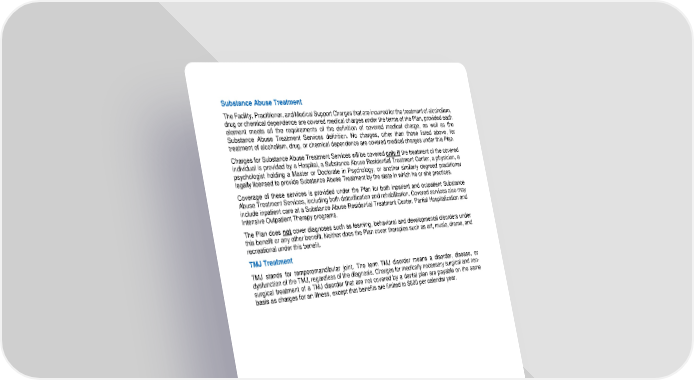 52 Subst ance Abuse Treatment The Facility, Practitioner, and Medical Support Charges that are incurred for the treatment of alcoholism, drug or chemical dependence are covered medical charges under the terms of the Plan, provided each element meets all the require ments of the definition of covered medical charge, as well as the Substance Abuse Treatment Services definition. No charges, other than those listed above, for treatment of alcoholism, drug, or chemical dependence are covered medical charges under this Pla n. Charges for Substance Abuse Treatment Services will be covered only if the treatment of the cove red individual is provided by a Hospital, a Substance Abuse Residential Treatment Center, a physician, a psychologist holding a Master or Doctorate in Psycho logy, or another similarly degreed practitioner legally licensed to provide Substance Abuse Treatment by the state in which he or she practices. Coverage of these services is provided under the Plan for both inpatient and outpatient Substance Abuse Treatm ent Services, including both detoxification and rehabilitation. Covered services also may include inpatient care at a Substance Abuse Residential Treatment Center, Partial Hospitalization and Intensive Outpatient Therapy programs. The Plan does not cover d iagnoses such as learning, behavioral and developmental disorders under this benefit or any other b enefit. Neither does the Plan cover therapies such as art, music, drama, and re creational under this benefit. TMJ Treatment TMJ stands for temporomandibular joint. The term TMJ disorder means a disorder, disease, or dysfunction of the TMJ, regardless of t he diagnosis. Charges for medically necessary surgical and non - surgical treatment of a TMJ disorder that are not covered by a dental plan are payable on the same basis as charges for an illness, except that benefits are limited to $600 per calendar year.