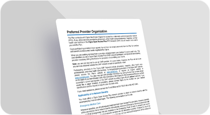 26 Preferred Provider Organization The Plan contracts with Cigna Healthcare (Cigna) for access to a nationwide preferred provider network (PPO). If you utilize services provided by physicians, other health care professionals, hospitals, or other health care facilities in the Cigna Open Access Plus PPO Network (OAP) this will result in less cost to you and the Plan. Cigna participating providers have agreed, by contract, to accept payments from the Plan for services and benefits at discounted levels negotiated by Cigna. When you are seeking services from a pro vider, please present your medical ID card at each visit. The card identifies you as a Cigna Open Access Plus (OAP) network participant, and gives the participating provider necessary billing information for purposes of submitting your claims. Note: you are not required to use an OAP provider. It is your choice. However, the Plan will not cover any services obtained outside the OAP network except as specifically noted . Participating providers in the Cigna OAP Network include physicians, hospitals, other health care professionals, and other health care facilities. To find parti cipating providers in the Cigna OAP network, please access the Plan’s website at www.iambtf.org , or register on Cigna’s website at www.mycigna.com . You also may get OAP provider information by calling the toll - free number shown on the back of your identification card, 800 - 244 - 6224 or 800 - Cigna 24. We recommend that you confirm a provider’s current par ticipation in the OAP network by calling Cigna directly before treatment. If y ou would like a paper directory of providers, please contact Cigna at the number on your medical identification card to request a copy for your zip code area. If you need assista nce, please contact the Fund Office at 202 - 785 - 8148 or 800 - 457 - 3481. Applicability of In - Network Benefits You must utilize a Cigna Open Access Plus network provider to obtain in - network benefits with the accompanying financial advantages. The followi ng are exceptions to this rule: Emergency Medical Care Whenever possible, you should request treatment from Open Access Plus providers. However, benefits will be provided at the in - network level for all medically necessary Emergency Services associated with true medical Emergencies that are received in the Emergency Room of both in - network and out - of - network hospitals (even if out - of - network services are not otherwise covered) . C harges for use of an out - of - network Emergency Room for services that are not true med ical Emergencies will be subject to denial by the Plan. If You’re Not Able to Access an In - Network Provider Except where benefits are specifically limited to in - network providers, if there are no Cigna Open Access Plus providers within a 25 - mile radius of your home, benefits will be provided at the in - network level for any c overed provider that is located with in the 25 - mile radius of your home , regardless of network participation of the provider. Outside the 25 - mile radius surrounding your home, the normal in - network and out - of - network rules will apply based on the provider’s network status . You may want to inquire of the provider’s status before obtaining services outside the 25 - mile radius, because services obtained from an o ut - of - network provider will not be covered by the Plan. Hospital Assigned Services Whenever possible, you should advise your hospital and your attending physician or Allied Health Professional of your need to use Open Access Plus providers for all referral services. However, if you rece ive services from a Cigna Open Access Plus participating hospital, and the hospital makes a referral to a non - participating provider, benefits for covered services will be provided at the in - network level.