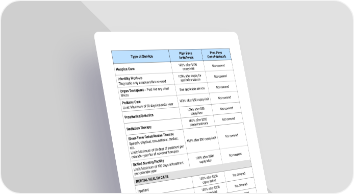 3 Type of Service Plan Pays In - Network Plan Pays Out - of - Network Hospice Care 100% after $100 copay / v isit Not covered Infertility Work - up Diagnostic only - treatment Not covered 100% after copay for applicable service Not covered Organ Transplant – Paid like any other illness See applicable service Not covered Podiatry Care Limit: Maximum of 30 days/calendar year 100% after $50 copay /visit Not covered Prosthetics/Orthotics 100% after $50 copay /item Not covered Radiation Therapy 100% after $200 copay/treatment Not covered Short - Term Rehabilitative Therapy Speech, physical, occupational, cardiac, etc. Limit: Maximum of 50 days of treatment per calendar year for all covered therapies 100% after $50 copay /visit Not covered Skilled Nursing Facility Limit: Maximum of 100 days of treatment per calendar year 100% after $200 copay / stay Not covered MENTAL HEALTH CARE Inpatient 100% after $500 copay/admit Not covered Outpatient Facility 100% after $200 copay/visit Not covered Outpatient Visit 100% after $50 copay/visit Not covered SUBSTANCE ABUSE TREATMENT Inpatient Hospital 100% after $500 copay /admit Not covered Outpatient Facility 100% after $200 copay /visit Not covered Outpatient Visit 100% after $50 copay /visit Not covered