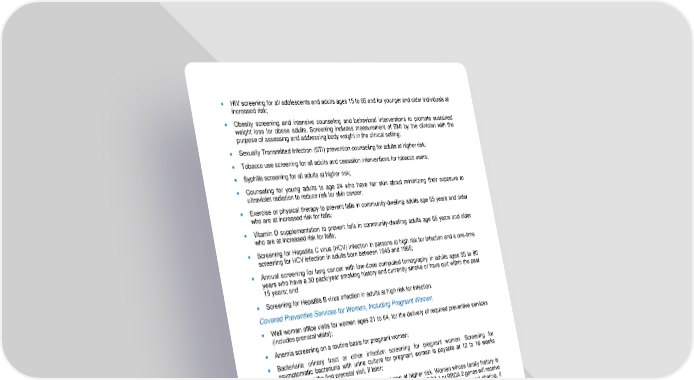 44 • HIV screening for all adol escents and adults ages 15 to 65 and for younger and older individuals at increased risk; • Obesity screening and intensive counseling and behavioral interventions to promote sustained weight loss for obese adults. Screening includes measurement of BMI by th e clinician with the purpose of assessing and addressing body weight in the clinical setting; • Sexually Transmitted Infection (STI) prevention counseling for adults at higher risk; • Tobacco use screening for all adults and cessation interventions for tobacco users; • Syphilis screening for all adults at higher risk; • Counseling for young adults to age 24 who have fair skin about minimizing their exposure to ultraviolet radiation to reduce risk for skin cancer; • Exercise or physical therapy to prevent falls in com munity - dwelling adults age 65 years and older who are at increased risk for falls; • Vitamin D supplementation to prevent falls in community - dwelling adults age 65 years and older who are at increased risk for falls; • Screening for H epatitis C virus (HCV) inf ection in persons at high risk for infection and a one - time screening for HCV infection in adults born between 1945 and 1965; • Annual screening for lung cancer with low - dose computed tomography in adults ages 55 to 80 years who have a 30 pack/year smoking h istory and currently smoke or have quit within the past 15 years; and • Screening for H epatitis B virus infection in adults at high risk for infection. Covered Preventive Services for Women, Including Pregnant Women • Well woman office visits for women ages 21 to 64, for the delivery of required preventive services (includes prenatal visits); • Anemia screening on a routine basis for pregnant women; • Bacteriuria urinary tract or other infection screening for pregnant women. Screening for asymptomatic bacteriuria w ith urine culture for pregnant women is payable at 12 to 16 weeks gestation or at the first prenatal visit, if later; • BRCA counseling about genetic testing for women at higher risk. Women whose family history is associated with an increased risk for delete rious mutations in BRCA 1 or BRCA 2 genes will receive referral for counseling. The Plan will also cover BRCA 1 or 2 genetic tests without cost - sharing, if appropriate as determined by the woman’s health care provider, including for a woman who has previou sly been diagnosed with cancer, as long as she is not currently symptomatic or receiving active treatment for breast, ovarian, tubal or peritoneal cancer; • Breast cancer screening mammography for women with or without clinical breast examination and with or without diagnosis, every 1 to 2 years for women aged 40 and older; • Breast cancer chemoprevention counseling for women at higher risk. The Plan will pay for counseling by physicians with women at high risk for breast cancer and at low risk for adverse effe cts of chemoprevention, to discuss the risks and benefits of chemoprevention. The Plan will also pay for risk - reducing medications for women at increased risk for breast cancer and at low risk for adverse medication effects; • Low - dose aspirin after 12 weeks of gestation for women who are at high risk for preeclampsia;