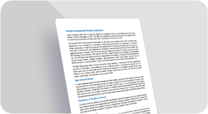 83 Review by Independent Review Organization Upon a determ ination that a request is eligible for expedited external review following the preliminary review, the Plan will assign an IRO. The Plan will expeditiously provide or transmit to the assigned IRO all necessary documents and information that it considered i n denying the claim. The assigned IRO, to the extent the information or documents are available and the IRO considers them appropriate, must consider the information or documents described in the procedures for standard review, previously. In reaching a de cision, the assigned IRO must review t he claim de novo (as if it is new) and is not bound by any decisions or conclusions reached during the Plan’s internal claims and appeals process. However, the IRO will be bound to observe the terms of the Plan to ensu re that the IRO decision is not contrary to the terms of the Plan, unless the terms are inconsistent with applicable law. The IRO also must observe the Plan’s requirements for benefits, including the Plan’s standards for clinical review criteria, medical n ecessity, appropriateness, health care setting, level of care, or effectiveness of a covered benefit, unless such requirements are inconsistent with applicable law. The IRO will provide notice of the final external review decision, in accordance with the r equirements set forth in this Section, as expeditiously as your medical condition or circumstances require, but in no event more than 72 hours after the IRO receives the request for an expedited external review. If the notice is not in writing, within 48 h ours after the date of providing that notice, the IRO must provide written confirmation of the decision to you and the Plan. After External Review If, upon external review, the IRO reverses the Plan’s denial, upon the Plan’s receipt of notice of such rever sal, the Plan will immediately provide coverage or payment for the reviewed claim. However, even after providing coverage or payment for the claim, the Plan may, in its sole discretion, seek judicial remedy to reverse or modify the IRO’s decision. If the f inal external review upholds the Plan’s denial, the Plan will continue not to provide coverage or payment for the reviewed claim. If you are dissatisfied with the external review determination, you may seek judicial review as permitted under ERISA Section 502(a). Elimination of Conflict of Interest To ensure that the persons involved with adjudicating claims and appeals (such as claim processors and medical experts) act independently and impartially, decisions related to those persons’ employment status (such as decisions related to hiring, compensation, promotion, termination or retention), will not be made on the basis of whether that person is likely to support a denial of benefits. Facility of Payment If the Board of Trustees or its designee determines that you cannot submit a claim or prove that you or your covered Dependent paid any or all of the charges for health care services that are cov e red by the Plan because you are incompetent or incapacitated, the Plan may, at its discretion, pay Plan benefits directly to the health care professional(s) who provided the health care services or supplies, or to any other individual who is providing for your care and support. Any such payment of Plan benefits will completely discharge the Plan’s obligations to the extent of that payment. Neither the Plan, Board of Trustees, appropriate Claims Administrator nor any other designee of the Plan will be requ ired to see to the application of the money so paid. Board of Trustee and IRO Decisions are Final and Binding The decision of the Board of Trustees and the IRO are final and binding on all parties, including anyone claiming a benefit on your behalf. Only as limited by the IRO, the Board of Trustees of the National IAM Benefit Trust Fund has full discretion and authority to determine all matters relating to the benefits provided under this Plan including, but not limited to, all questions of coverage, eligi bility, and methods of providing or arranging for benefits, as well as full discretion and authority over the standard of p roof required for any claim and