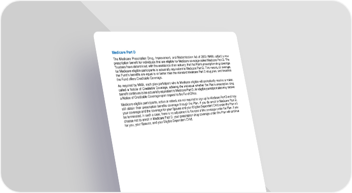61 Medicare Part D The Medicare Prescription Drug , Improvement , and Mo dernization Act of 2003 (MMA) added a new prescription benefit for individuals that are eligible for Medicare coverage called Medicare Part D. The Trustees have determined, with the assistance of an actuary, that the Plan’s prescription drug coverage for M edicare eligible participants is actuarially equivalent to Medicare Part D. This means, on average, the Fund’s benefits are equal to or better than the standard Medicare Part D drug plan, and therefore the Fund offers Creditable Coverage. As required by MM A, each plan participant who is Medicare eligible will periodically receive a notice, called a Notice of Creditable Coverage, advising the individual whether the Plan’s prescription drug benefit continues to be actuarially equivalent to Medicare Part D. An eligible participant also may receive a Notice of Creditable Coverage u pon request to the Fund Office. Medicare eligible participants, active or retired, are not required to sign up for Medicare Part D and may still obtain their prescription benefits cove rage through the Plan. If you do enroll in Medicare Part D, your cov erage and the coverage for your Spouse and your Eligible Dependent Child under the Plan will be terminated. In such a case, there is no adjustment to the cost of the coverage under the Pla n. If you choose not to enroll in Medicare Part D, your prescription drug coverage under the Plan will continue for you, your Spouse, and your Eligible Dependent Child.